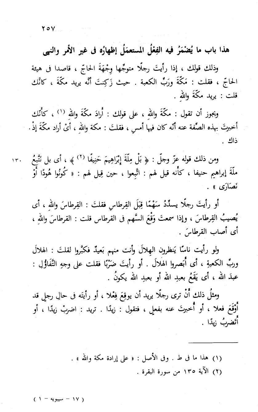 ومن ذلك قوله عزّ وجلّ: " بل ملة إبراهيم حنيفا "، أى بل نَتَّبعُ ملّةَ إبراهيم حنيفا، كأَنه قيل لهم: اتَّبِعوا، حين قِيل لهم: " كُونُوا هُوداً أَوْ نَصَارَى ".