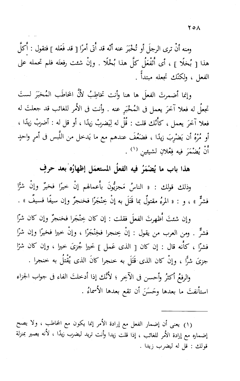 وإنما أضمرت الفعل ها هنا وأنت مخاطب لأنَّ المخاطَب المُخبَرَ لستَ تجعلُ له فعلا آخَرَ يعمل فى المُخْبَرِ عنه. وأنت فى الأمر للغائب قد جعلتَ له فعلا آخَرَ يعمل، كأَنّك قلت: قُلْ له لِيَضربْ زيداً، أو قل له: اضربْ زيداً، أو مُرْهُ أن يَضْرِبَ زيداً، فضَعُفَ عندهم مع ما يَدخل من اللَّبس فى أمرٍ واحدٍ أَنْ يُضْمَرَ فيه فِعْلانِ لشيئينِ.