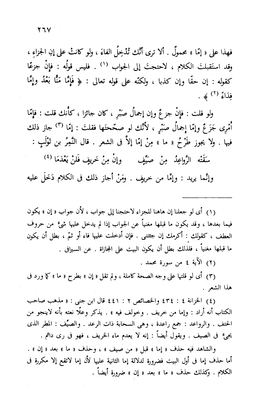 ولو قلت: فإِنْ جزعٌ وإن إِجمالُ صَبرِ، كان جائزا، كأَنك قلت: فإِمّا أَمْرِى جزعٌ وإمّا إِجمالُ صبرٍ، لأنَّك لو صحّحتَها فقلتَ: إمّا جاز ذلك فيها. ولا يجوز طَرْحُ ما مِنْ إمّا إلاَّ فى الشعر. قال النَّمِرُ بن تَوْلَبٍ: