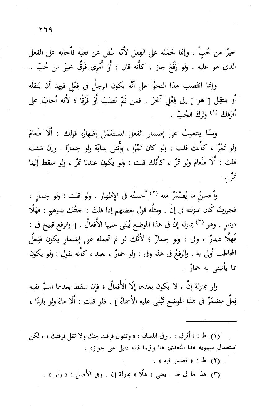 ومما يَنتصب على إضمار الفِعل المستعمَلِ إظهارُه قولك: أَلاَ طَعامَ ولو تَمْراً، كأَنك قلت: ولو كان تَمْراً، وأْتِنى بدابّة ولو حِماراً. وإن شئت قلت: أَلاَ طَعامَ ولو تمرٌ، كأَنّك قلت: ولو يكون عندنا تمرٌ، ولو سقط إلينا تمرٌ.