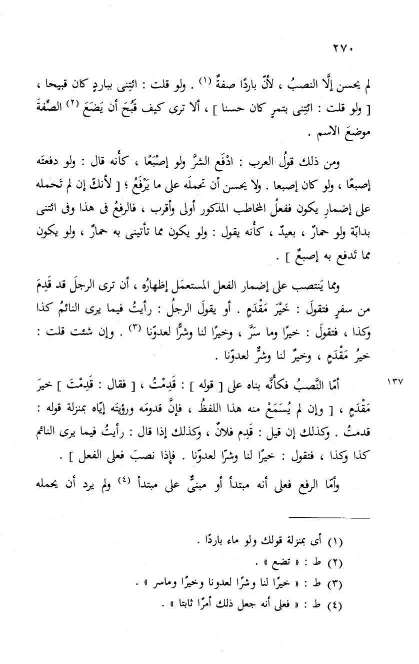ومما يَنتصب على إضمار الفعل المستعمَل إظهارُه، أن ترى الرجلَ قد قَدِمَ من سفرٍ فتقولَ: خَيْرَ مَقْدَمٍ. أو يقولَ الرجلُ: رأيتُ فيما يرى النائمُ كذا وكذا، فتقول: خيراً وما شر، وخيراً لنا وشرًّا لعدوّنا. وإن شئت قلت: خيرُ مَقْدَمٍ، وخيرٌ لنا وشرٌّ لعدوّنا.