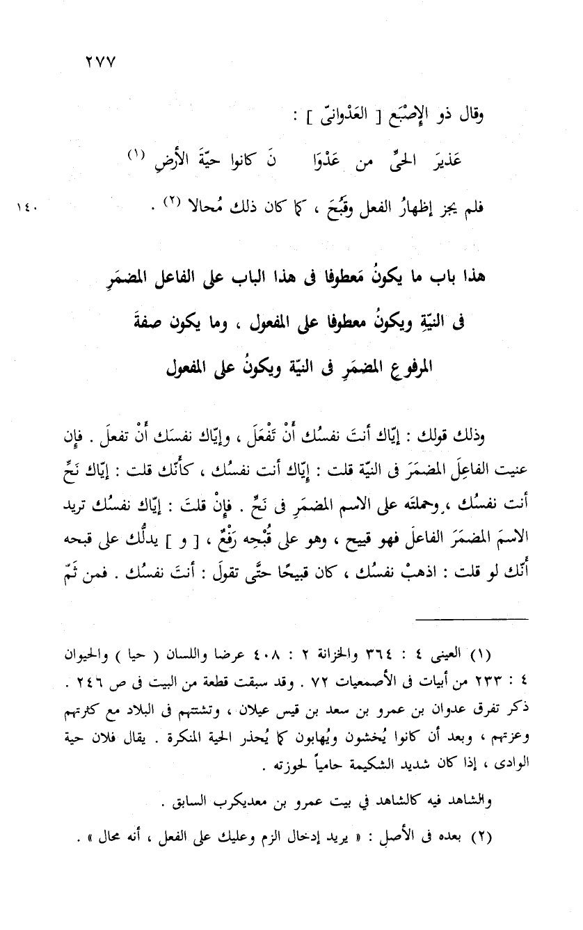 فى النيّةِ ويكونُ معطوفا على المفعول، وما يكون صفةَ المرفوعِ المضمَرِ فى النيّة ويكونُ على المفعول وذلك قولك: إيّاك أنتَ نفسُك أَنْ تَفْعَلَ، وإيّاك نفسَك أَنْ تفعلَ. فإِن عنيت الفاعِلَ المضمَرَ فى النيّة قلت: إِيّاك أنت نفسُك، كأَنّك قلت: إيّاك نَحَّ أنت نفسُك، وحملتَه على الاسم المضمَرِ فى نَحَّ. فإِنْ قلتَ: إيّاك نفسُك تريد الاسَم المضمَرَ الفاعل فهو قبيح، وهو على قُبْحِه رَفْعٌ، ويدلُّك على قبحه أَنّك لو قلت: اذهبْ نفسُك، كان قبيحاً حتَّى تقولَ: أنتَ نفسُك. فمن ثَمّ