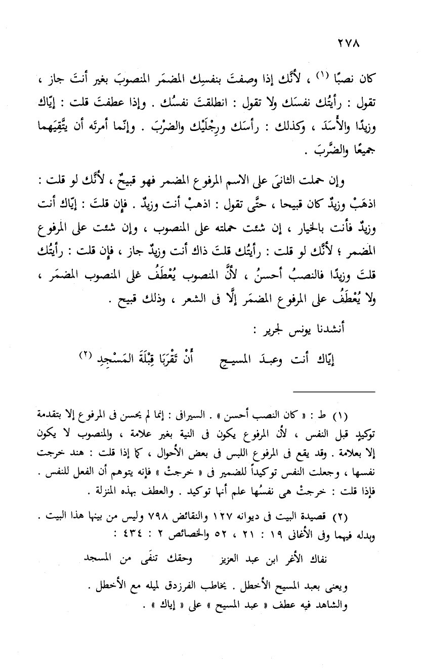 وإن حملت الثانىَ على الاسم المرفوع المضمر فهو قبيحٌ، لأنَّك لو قلت: اذهَبْ وزيدٌ كان قبيحا، حتَّى تقول: اذهبْ أنت وزيدٌ. فإِن قلتَ إيّاك أنت وزيدٌ فأنت بالخيار، إن شئت قلتَ ذاك أنت وزيدٌ جاز، فإِن قلت: رأيتك قلت ذاك وزيداً فالنصبُ أحسنُ، لأنَّ المنصوب يُعْطَفُ على المنصوب المضمَر، ولا يُعْطَفُ على المرفوع المضمَر إلاَّ فى الشعر، وذلك قبيح.
