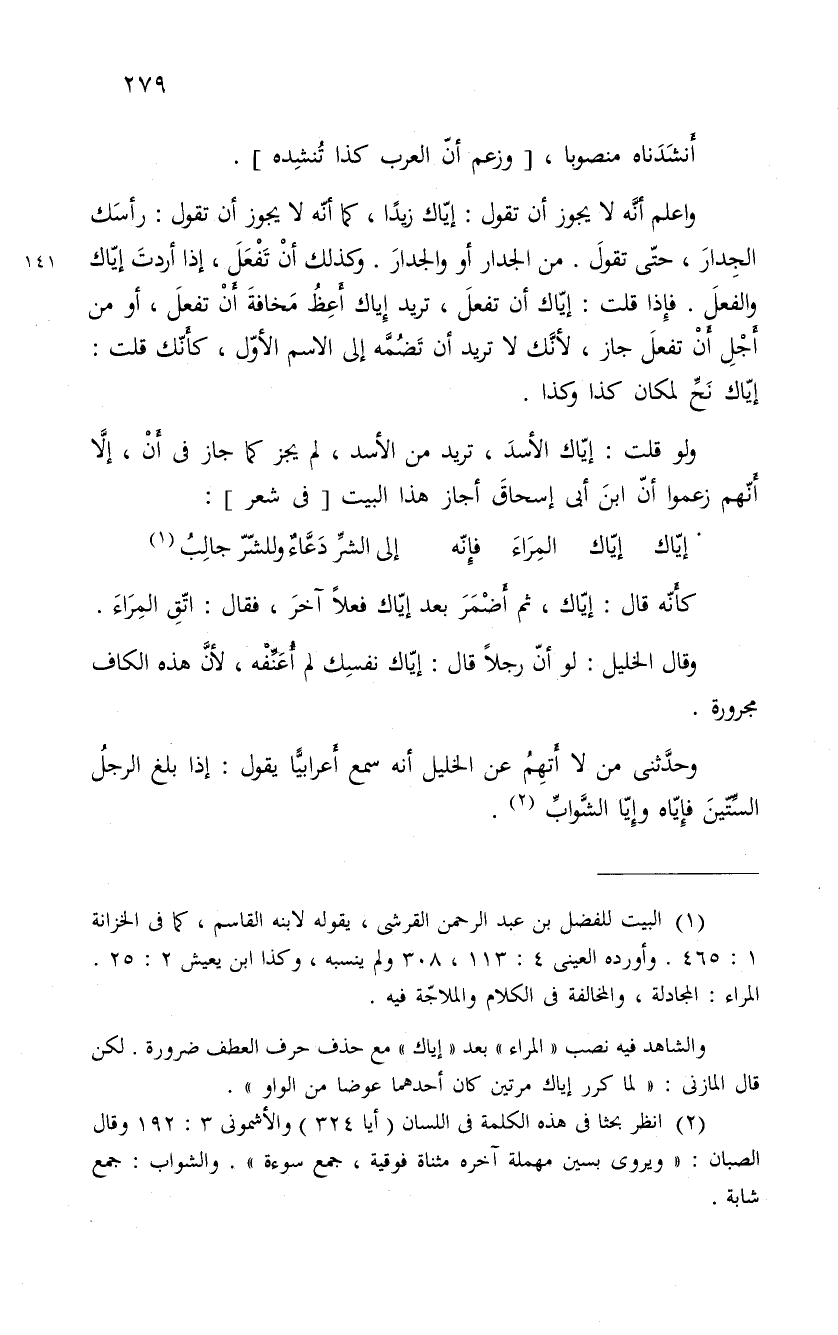 واعلم أنَّه لا يجوز أن تقول: إيّاك زيداً، كما أنّه لا يجوز أن تقول: رأسَك الجِدارَ، حتّى تقولَ: من الجدار أو والجدارَ. وكذلك أنْ تَفْعَلَ، إذا أردتَ إيّاك والفعلَ. فإِذا قلت: إيّاك أن تفعلَ، تريد إياك أعظ مخافة أن تفعل، أومن أَجْلِ أَن تفعلَ جاز، لأنَّك لا تريد أن تَضُمَّه إلى الاسم الأوّل، كأَنَّك قلت: إيّاك نَحَّ لمكان كذا وكذا.