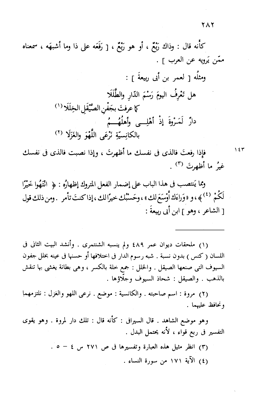 ومما يَنتصب فى هذا الباب على إضمار الفعل المتروك إظهارُه: " انتهوا خيرا لكم "، و " وَراءَك أَوْسَعَ لك "، وحَسْبُك خيراً لك، إذا كنتَ تأمر. ومن ذلك قول " الشاعر، وهو " ابن أبى ربيعةَ: