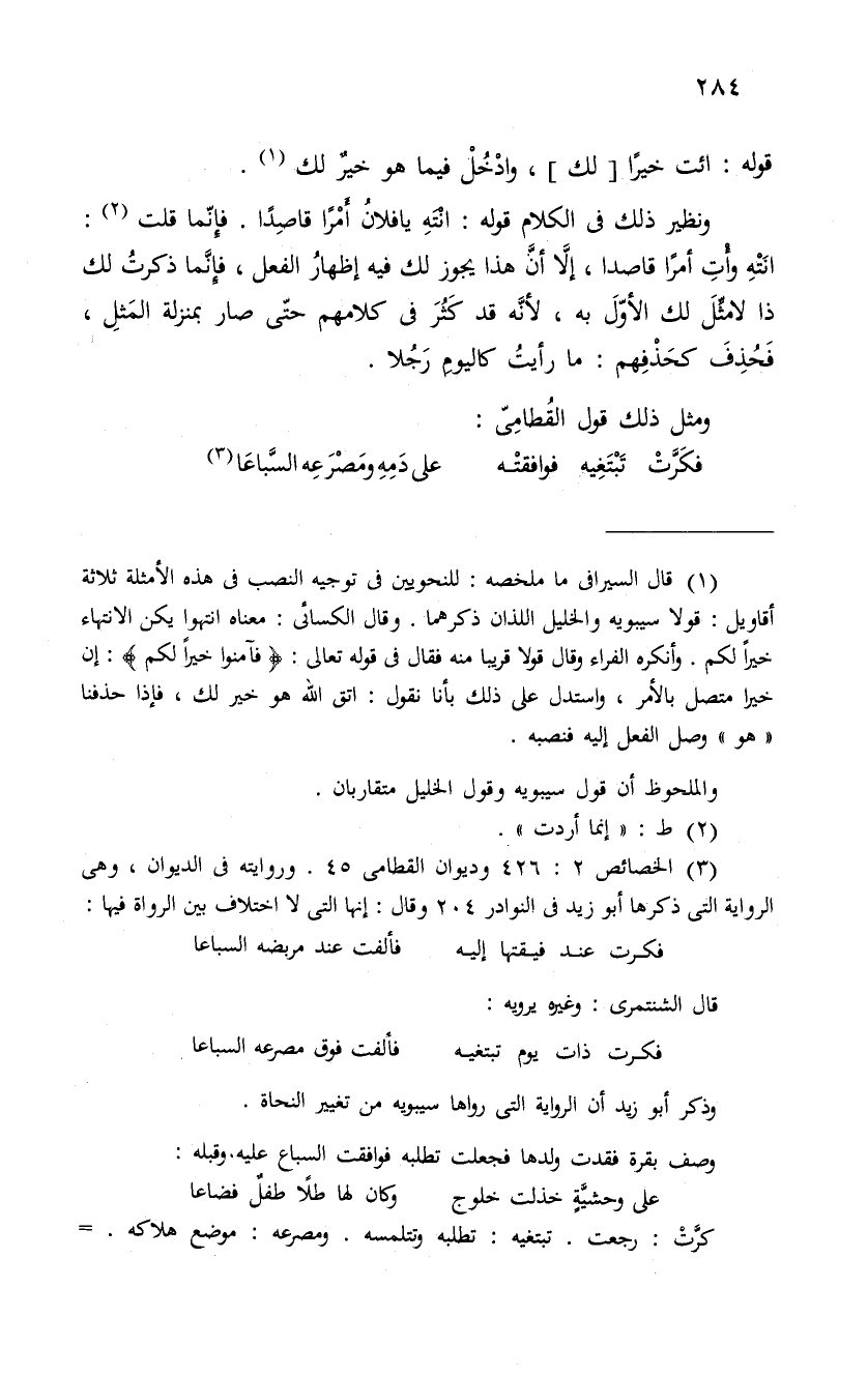 ونظير ذلك من الكلام قوله: انْتَهِ يا فلانُ أَمْراً قاصِداً. فإنما قلت: انته وائت أمراً قاصدا، إلاَّ أنَّ هذا يجوز لك فيه إظهارُ الفعل، فإِنَّما ذكرتُ لك ذا لامثَّلَ لك الأوّلَ به، لأنَّه قد كَثُرَ فى كلامهم حتّى صار بمنزلة المَثلِ، فَحُذِفَ كحذفهم: ما أريت كاليومِ رَجُلا.