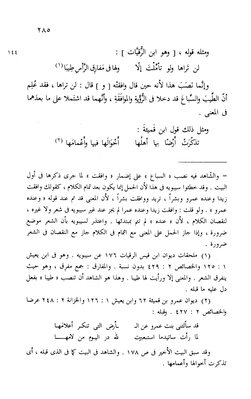 وإنَّما نَصَبَ هذا لأنه حين قال وافقتْه " و " قال: لن تراها، فقد عُلِم أنّ الطَّيبَ والسَّباع قد دخلا فى الرُّؤْيِة والموافَقَةِ، وأنَّهما قد اشتَملا على ما بعدَهما فى المعنى.