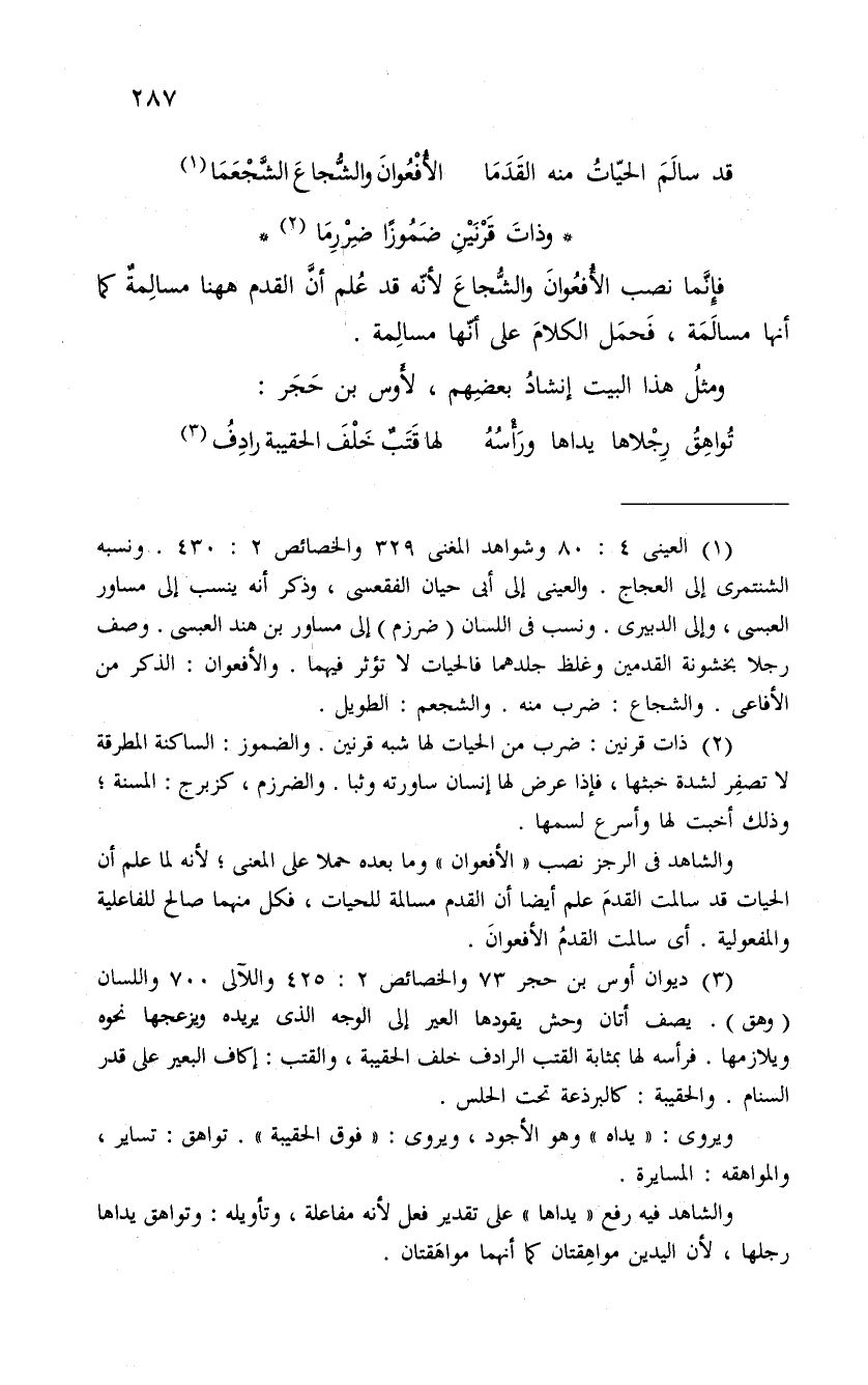 فإِنَّما نصب الأُفعُوانَ والشُّجاعَ لأنّه قد عُلم أنَّ القدم ههنا مسالِمةٌ كما أنها مسالَمَة، فَحمَل الكلامَ على أنّها مسالِمة.