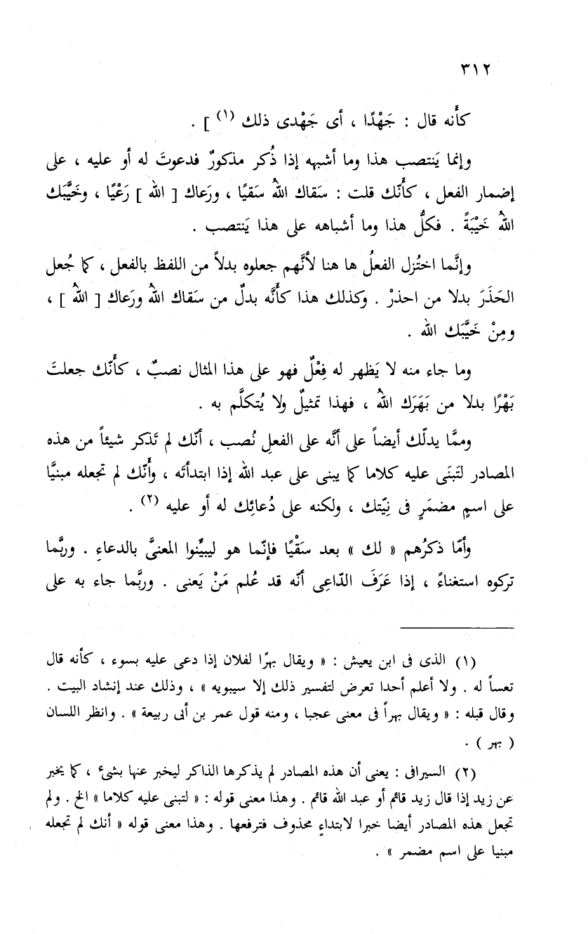 وممَّا يدلّك أيضاً على أنَّه على الفعلِ نُصب، أنّك لم تَذكر شيئاً من هذه المصادر لتَبنَى عليه كلاما كما يبنى على عبد الله إذا ابتدأتَه، وأَنّك لم تجعله مبنيَّا على اسمٍ مضمَر فى نِيّتك، ولكنه على دُعائِك له أو عليه.