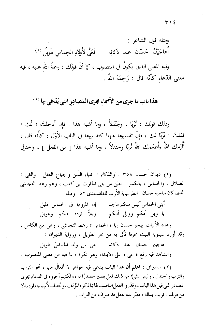 وذلك قولك: تُرْباً، وجَنْدَلاً، وما أِشبه هذا. فإِن أدخلت " لك " فقلت: ترباً لك. فإن تفسيراً ههنا كتفسيرها فى الباب الأوّل، كأَنه قال: أَلْزَمك اللهُ وأَطعَمك اللهُ تُرباً وجندلاً، وما أشبه " من الفعل "، واختزل