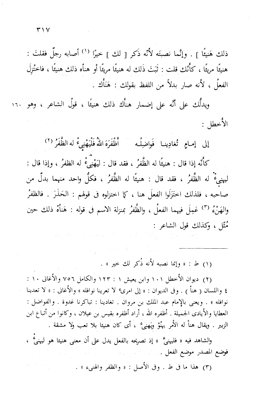 كأَنّه إذا قال: هنيئاً له الظَّفرُ، فقد قال: ليَهْنِئْ له الظفرُ، وإذا قال: ليهنِئْ له الظَّفرُ، فقد قال: هنيئاً له الظَّفرُ، فكلُّ واحد منهما بدلٌ من صاحبه، فلذلك اختَزَلَوا الفعلَ هنا، كما اختزلوه فى قولهم: الحَذَرَ. فالظفرُ والهنئ عَمِلَ فيهما الفعلُ، والظَّفرُ بمنزلة الاسم فى قوله: هَنأهُ ذلك حين مُثّل. وكذلك قول الشاعر: