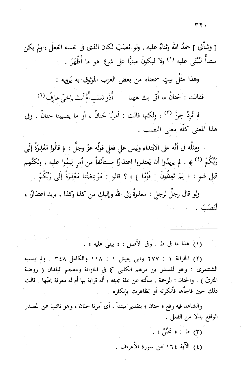 ومثلُه فى أنَّه على الابتداء وليس علِى فعلٍ قولُه عزّ وجلَّ: " قالوا معذرة إلى ربكم ". لم يريدُوا أن يَعتذروا اعتذاراً مستأنَفاً من أمرٍ لِيمُوا عليه، ولكنَّهم قيل لهم: " لِمَ تَعِظُونَ " قَوْماً "؟ قالوا: مَوْعِظتُنا مَعْذِرَةٌ إلَى رَبَّكُم.