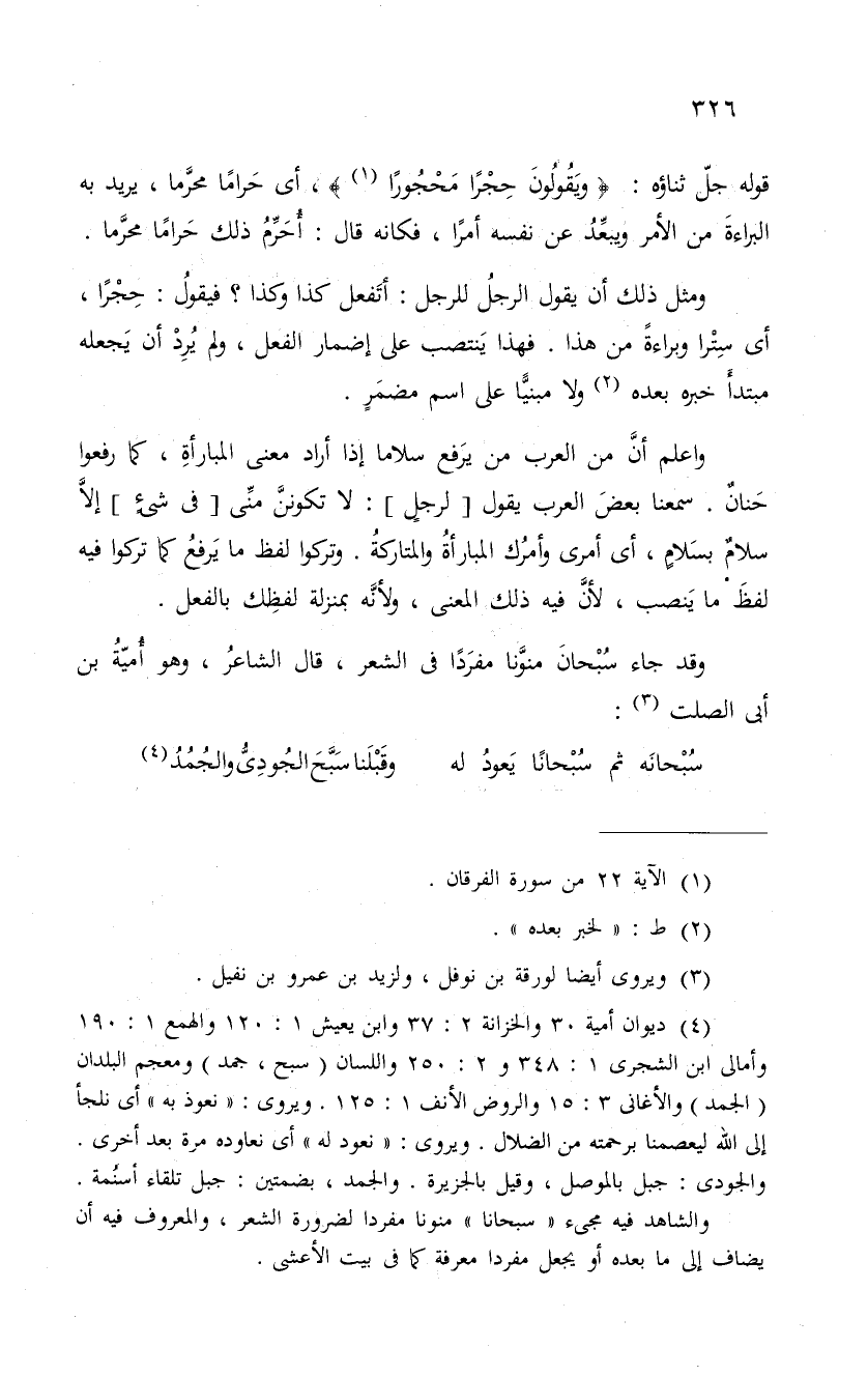 وقد جاء سُبْحانَ منوَّنا مفرَداً فى الشعر، قال الشاعرُ، وهو أمية ابن أبى الصلت: