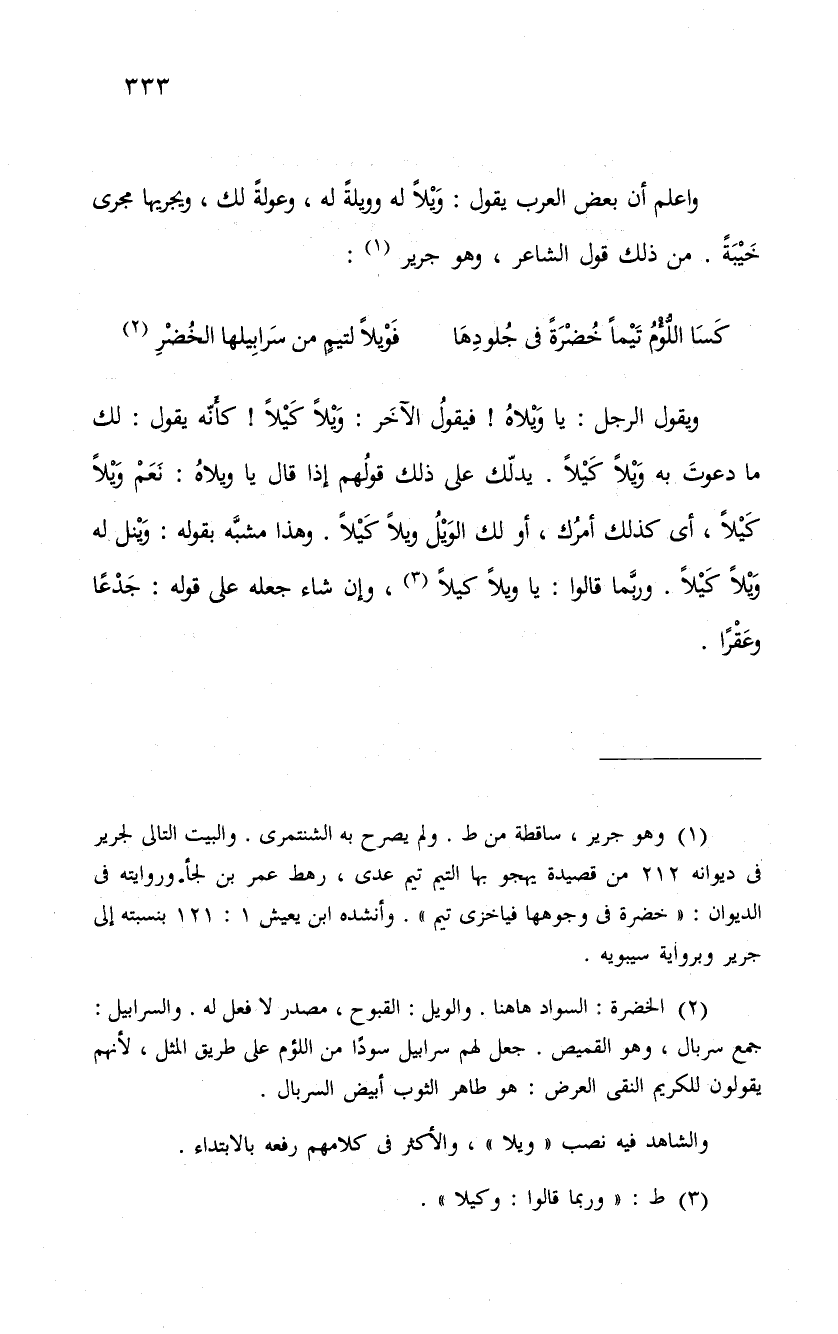 واعلم أن بعض العرب يقول: وَيْلاً له وويلةً له، وعولةً لك، ويجريها مجرى خَيْبَةً. من ذلك قول الشاعر، وهو جرير: