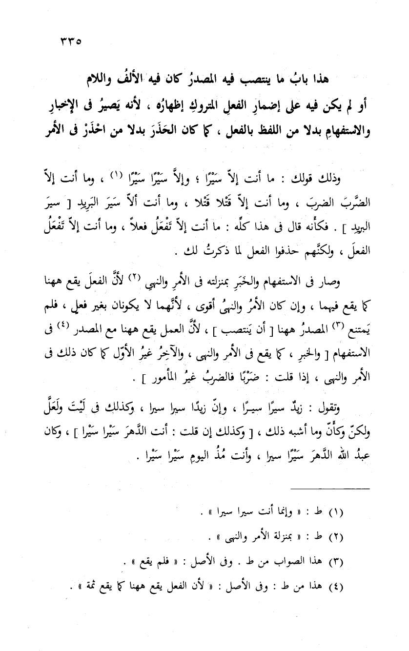 كان فيه الألفُ واللام أو لم يكن فيه على إضمارِ الفعلِ المتروكِ إظهارُه، لأنه يَصيرُ فى الإِخبارِ والاستفهامِ بدلا من اللفظ بالفعل، كما كان الحَذَرَ بدلا من احْذَرْ فى الأمر وذلك قولك: ما أنت إلاّ سَيراً، وإلاَّ سَيراً سَيْراً، وما أنت إلاّ الضَّربَ الضربَ، وما أنت إلاّ قَتْلا قَتْلا، وما أنت ألاّ سَيرَ البَريِد " سيرَ البريِد ". فكأَنه قال فى هذا كلَّه: ما أنت إلاّ تَفْعَلُ فعلاً، وما أنت إلاّ تَفعَلُ الفعلَ، ولكنَّهم حذفوا الفعل لما ذكرتُ لك.