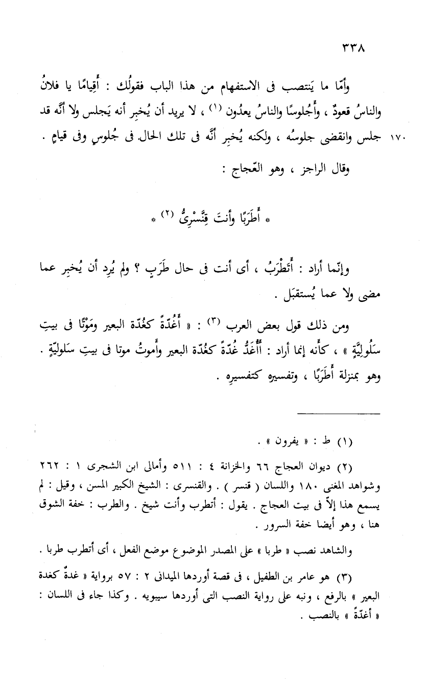 وأمّا ما يَنتصب فى الاستفهام من هذا الباب فقولُك: أَقِياماً يا فلانُ والناسُ قعودٌ، وأََجُلوساً والناسُ يعدُون، لا يريد أن يُخبرِ أنه يَجلس ولا أنَّه قد جلس وانقضى جلوسُه، ولكنه يُخبرِ أنَّه فى تلك الحال فى جُلوسٍ وفى قيامٍ.