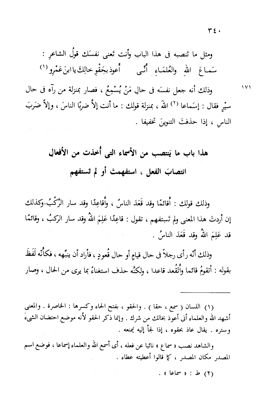 وذلك أنه جعل نفسَه فى حالِ مَنْ يُسْمِعُ، فصار بمنزلة من رآه فى حال سيْرٍ فقال: إسَماعا الله، بمنزلة قولك: ما أنت إلاَّ ضربًا الناسَ، وإلاّ ضَربَ الناسِ، إذا حذفتَ التنوينَ تخفيفا.