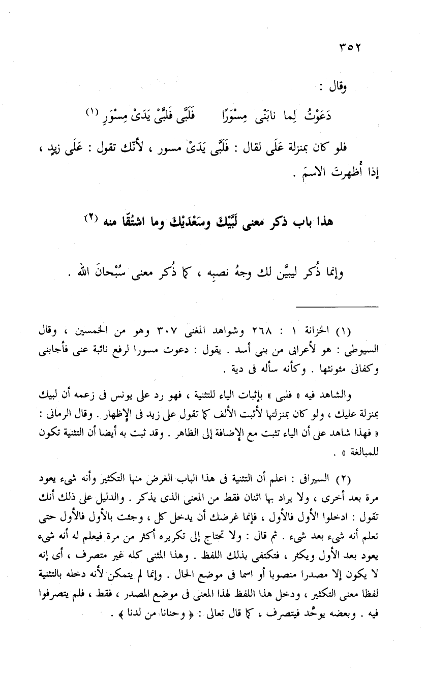 فلو كان بمنزلة عَلَى لقال: فَلَبَّى يَدَىْ مسور، لأنّك تقول: عَلَى زيدٍ، وإذا أظهرت الاسم.