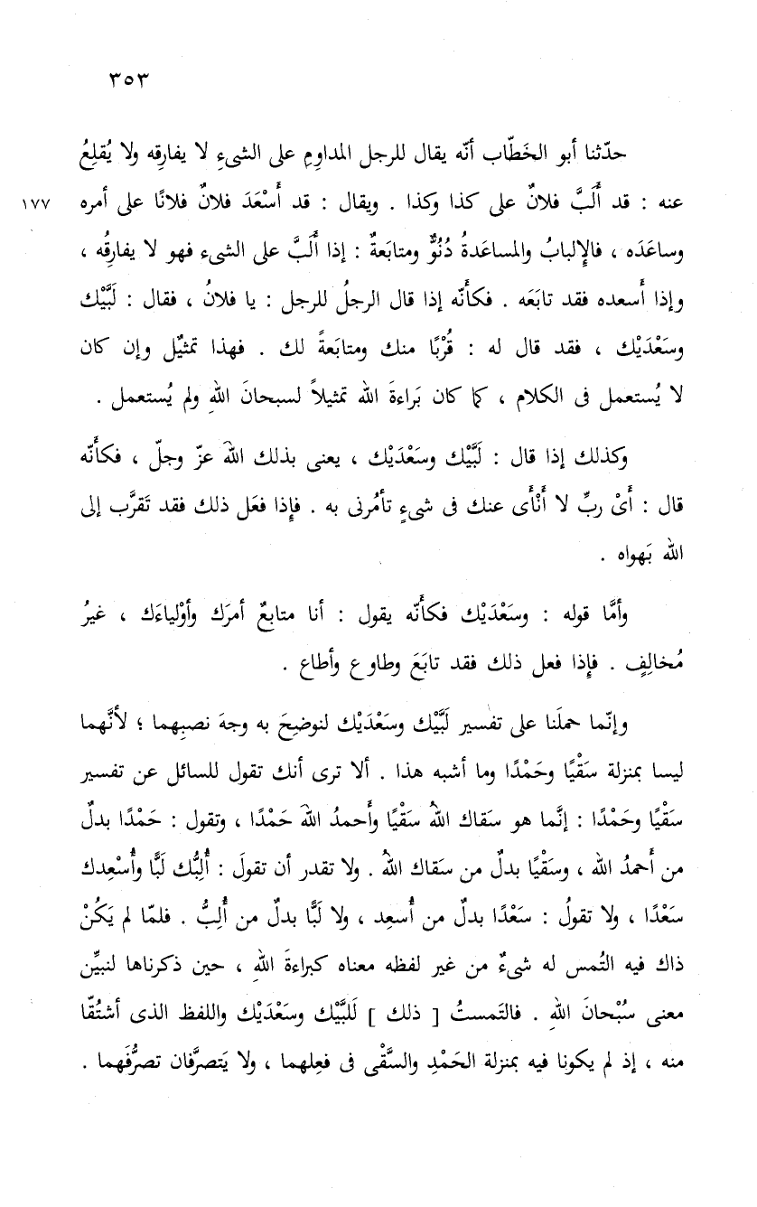 وإنّما حملَنا على تفسير لَبَّيْك وسَعْدَيْك لنوضِحَ به وجه نصبِهما؛ لأنَّهما ليسا بمنزلة سَقياً وحَمْداً وما أِشبه هذا. ألا ترى أنك تقول للسائل عن تفسير سَقيًا وحَمْداً: إنَّما هو سَقاك اللهُ سَقْيًا وأَحمدُ الله حَمْداً، وتقول: حَمْداً بدلٌ من أَحمدُ الله، وسَقيًا بدلٌ من سَقاك اللهُ. ولا تقدر أن تقولَ: أُلِبُّك لَبًّا وأُسْعِدك سَعْداً، ولا تقولُ: سَعْداً بدلٌ من أُسعِد، ولا لَبًّا بدلٌ من أُلِبُّ. فلمّا لم يَكُنْ ذاك فيه التمس له شيء من غير لفظه معناه كبراءةَ اللهِ، حين ذكرناها لنبيَّن معنى سُبْحانَ اللهِ. فالتَمستُ " ذلك " لَلبَّيْك وسَعْدَيْك واللفظ الذى أشتُقّا منه، إذ لم يكونا فيه بمنزلة الحَمْدِ والسَّقْى فى فعِلهما، ولا يَتصرَّفان تصرُّفَهما.
