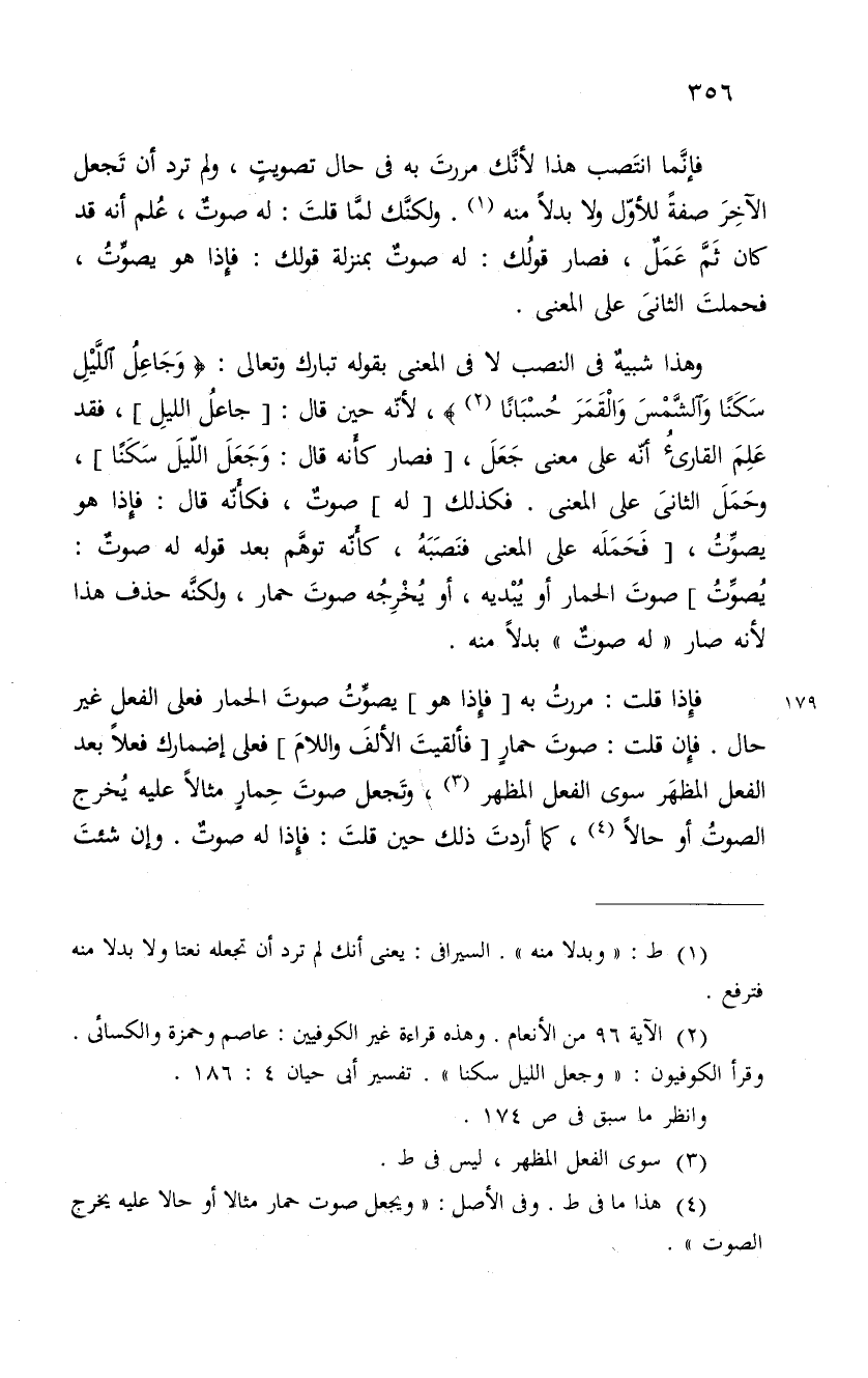 وهذا شبيهٌ فى النصب لا فى المعنى بقوله تبارك وتعالى: " وَجَاعِلُ اللَّيْلِ سَكَنًا والشَّمْسَ وَالْقَمَرَ حُسْبَاناً "، لأنّه حين قال: " جاعلُ الليلِ "، فقد عَلِمَ القارئُ أنّه على معنى جَعَلَ، " فصار كأَنه قال: وَجَعَلَ اللّيلَ سَكَنًا "، وحَمَلَ الثانىَ على المعنى. فكذلك " له " صوتٌ، فكأَنّه قال: فإِذا هو يصوَّتُ، " فَحَمَلَه على المعنى فنَصَبَهُ، كأَنّه توهَّم بعد قوله له صوتٌ: يُصوَّتُ " صوتَ الحمار أو يُبْديه، أو يُخْرِجُه صوتَ حمار، ولكنّه حذف هذا لأنه صار " له صوتٌ " بدلاً منه.