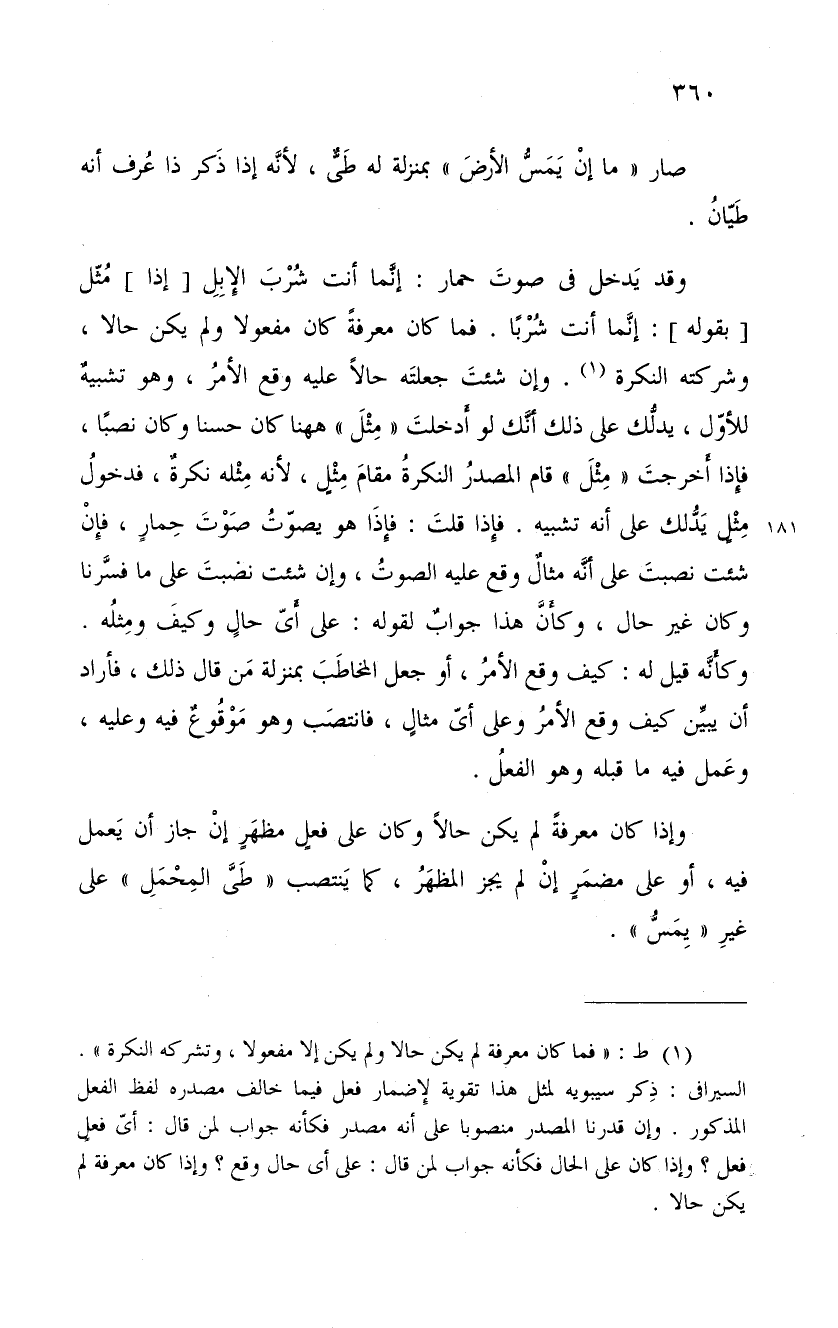 وقد يَدخل فى صوتَ حمار: إنَّما أنت شُرْبَ الإِبِلِ " إذا " مُثّل " بقوله ": إنَّما أنت شُرْباً. فما كان معرفةً كان مفعولا ولم يكن حالا، وشركته النكرة. وإن شئتَ جعلتَه حالاً عليه وقع الأمر، وهو تشبيهه للأوّل، يدلُّك على ذلك أنَّك لو أَدخلتَ " مِثْلَ " ههنا كان حسنا وكان نصباً، فإِذا أَخرجتَ " مِثْلَ " قام المصدرُ النكرةُ مقامَ مِثْلٍ، لأنه مِثْله نكرةٌ، فدخولُ مِثْلٍ يَدُّلك على أنه تشبيه. فإِذا قلتَ: فإِذا هو يصوتُ صَوْتَ حِمارٍ، فإِنْ شئت نصبتَ على أنَّه مثالٌ وقع عليه الصوتُ، وإن شئت نصبتَ على ما فسَّرنا وكان غير حال، وكأَنَّ هذا جوابٌ لقوله: على أَىّ حالٍ وكيفَ ومِثلُه. وكأَنَّه قيل له: كيف وقع الأمرُ، أو جعل المخاطَبَ بمنزلة مَن قال ذلك، فأراد أن يبيَّن كيف وقع الأمرُ وعلى أىّ مثالٍ، فانتصَب وهو مَوْقُوعٌ فيه وعليه، وعَمل فيه ما قبله وهو الفعلُ.