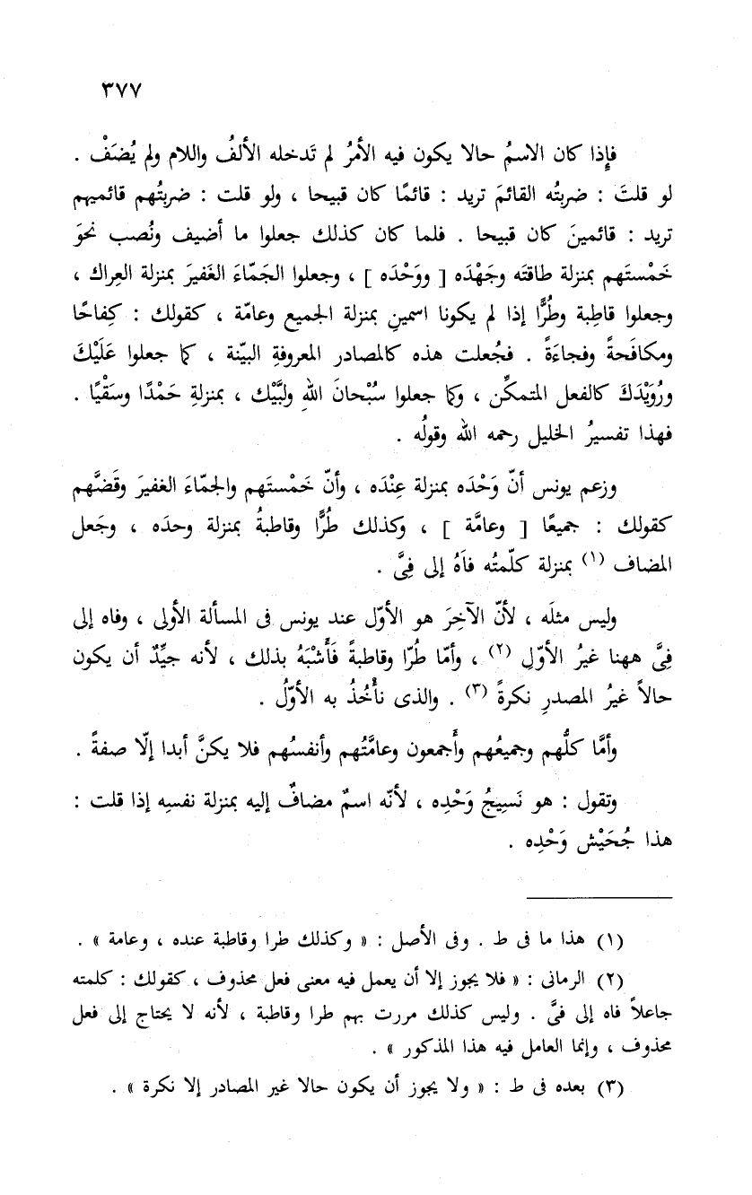 فإِذا كان الاسمُ حالا يكون فيه الأمرُ لم تَدخله الألفُ واللام ولم يُضَف. لو قلتَ: ضربتُه القائمَ تريد: قائماً كان قبيحا، ولو قلت: ضربتُهم قائميهم تريد: قائمينَ كان قبيحا. فلما كان كذلك جعلوا ما أضيف ونُصب نحوَ خَمْستَهم بمنزلة طاقتَه وجَهْدَه " ووَحْدَه "، وجعلوا الجَمّاءَ الغَفيرَ بمنزلة العِراك، وجعلوا قاطِبة وطُرًّا إذا لم يكونا اسمينِ بمنزلة الجميع وعامّة، كقولك: كِفاحاً ومكافَحةً وفجاءَةً. فجعلت هذه كالمصادر المعروفةِ البيّنة، كما جعلوا عَلَيْكَ وروُيْدَكَ كالفعل المتمكَنّ، وكما جعلوا سُبْحانَ اللهِ ولبَّيْك، بمنزلةِ حَمْداً وسَقْياً. فهذا تفسيرُ الخليل رحمه الله وقولُه.