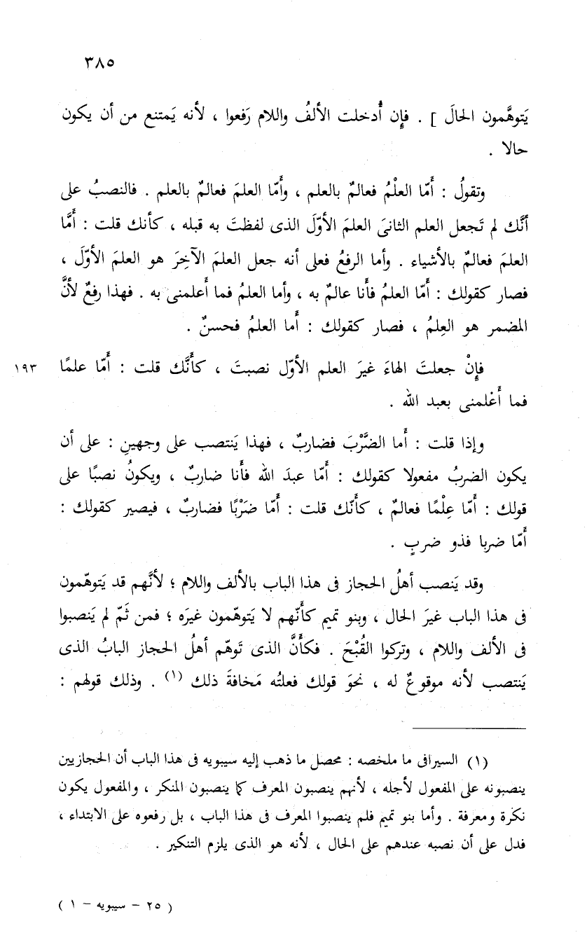 وقد يَنصب أهلُ الحجاز فى هذا الباب بالألف واللام، لأنهم قد يتوهمون في هذا الباب غيرَ الحال، وبنو تميم كأَنهم لا يَتوهّمون غيرَه، فمن ثَمّ لم يَنصبوا فى الألف واللام، وتركوا القُبْحَ. فكأَنَّ الذى تَوهّم أهلُ الحجاز البابُ الذى يَنتصب لأنه موقوعٌ له، نحوَ قولك فعلتُه مَخافةَ ذلك. وذلك قولهم: