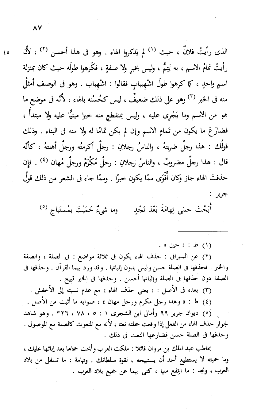 الذى رأيتُ فلانٌ، حيث لم يَذكروا الهاء. وهو فى هذا أحسن، لأن رأيتُ تمامُ الاسم، به يتم، وليس بخبرٍ ولا صفةٍ، فكَرهوا طولَه حيث كان بمنزلة اسمٍ واحدٍ، كما كرِهوا طولَ اشْهِيبابٍ فقالوا: اشْهِباب. وهو فى الوصف أمثلُ منه فى الخبر وهو على ذلك ضعيفٌ، ليس كحُسنْه بالهاء، لأنّه فى موضع ما هو من الاسم وما يَجْرِى عليه، وليس بمنقطعٍ منه خبرا مبنيًّا عليه ولا مبتدأً، فضارَعَ ما يكون من تَمامِ الاسم وإن لم يكن تماماً له ولا منه فى البناء. وذلك قولُك: هذا رجلٌ ضربتهُ، والناسُ رجلانِ: رجلٌ أكرمته ورجلٌ أهنتهُ، كأنّه قال: هذا رجلٌ مضروبٌ، والناسُ رجلانِ: رجلٌ مُكْرَمٌ ورجلٌ مْهان. فإن حذفتَ الهاء جاز وكان أَقْوَى ممّا يكون خبراً. وممّا جاء فى الشعر من ذلك قولُ جرير: