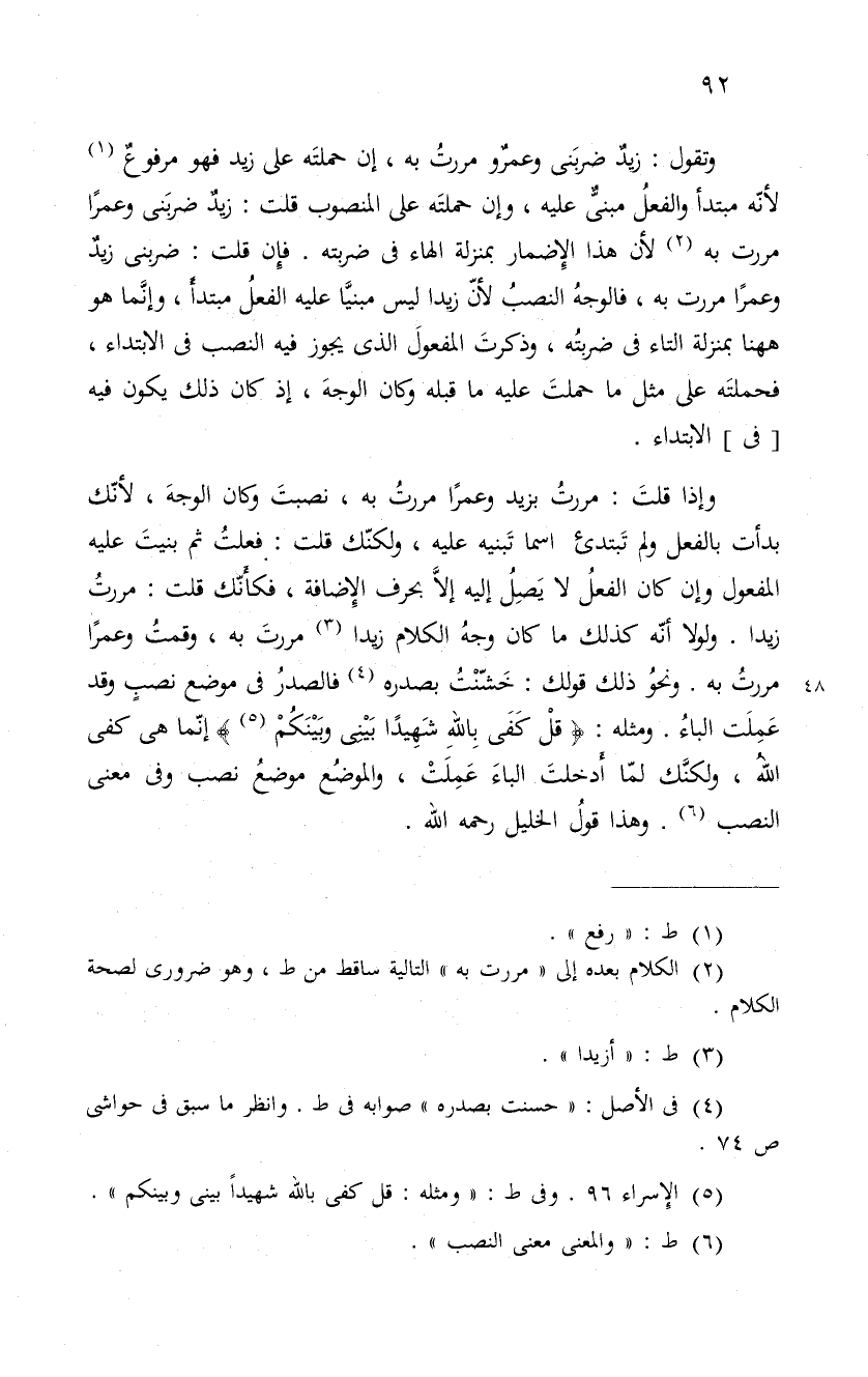 وإذا قلتَ: مررتُ يزيد وعمراً مررتُ به، نصبتَ وكان الوجهَ، لأنّك بدأت بالفعل ولم تَبتدئ اسما تَبنيه عليه، ولكنّك قلت: فعلتُ ثم بنيتَ عليه المفعول وإن كان الفعلُ لا يَصِلُ إليه إلاَّ بحرف الإِضافة، فكأَنّك قلت: مررتُ زيدا. ولولا أنّه كذلك ما كان وجهُ الكلام زيدا مررتَ به، وقمتُ وعمراً مررتُ به. ونحوُ ذلك قولك: خَشّنْتُ بصدره فالصدرُ فى موضع نصب وقد عملت الباء. و " كَفَى باِلله شَهِيداً بَيْنِى وبَيْنَكُمْ " إنّما هى كفى اللهُ، ولكنَّك لمّا أَدخلتَ الباءَ عَمِلَتْ، والموضُع موضعُ نصب وفى معنى النصب. وهذا قولُ الخليل رحمه الله.