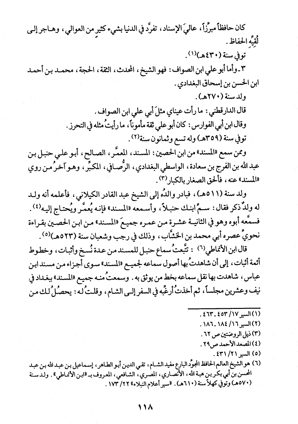 قال ابن الأنماطي (¬6): تتَّبعتُ سماع حنبل للمسند من عدة نُسخ وأثبات، وخطوط أئمة أثبات، إلى أن شاهدتُ بها أصول سماعه لجميع "المسند" سوى أجزاء من مسند ابن عباس، شاهدت بها نقل سماعه بخط من يوثق به. وسمعتُ منه جميع "المسند" ببغداد في نيف وعشرين مجلساً، ثم أخذتُ أرغِّبه في السفر إلى الشام، وقلتُ له: يحصُلُ لك من