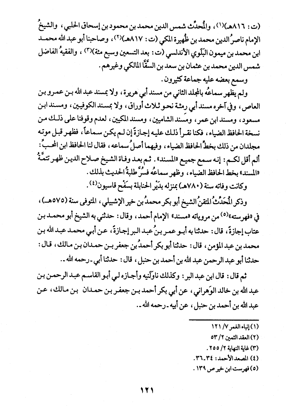 ولم يظهر سماعُه بالمجلد الثاني من مسند أبي هريرة، ولا بمسند عبد الله بن عمرو بن العاص، وفي آخره مسند أبي رِمثة نحو ثلاث أوراق، ولا بمسند الكوفيين، ومسند ابن مسعود، ومسند ابن عمر، ومسند الشاميين، ومسند المكيين، لعدم وقوفنا على ذلك من نسخة الحافظ الضياء، فكنا نقرأ ذلك عليه إجازةً إن لم يكن سماعاً، فظهر قبل موته مجلدان من ذلك بخطِّ الحافظ الضياء، وفيهما أصلُ سماعه، فقال لنا الحافظ ابن المحبِّ: ألم أقل لكم: إنه سمع جميع "المسند". ثم بعد وفاة الشيخ صلاح الدين ظهر تتمَّةُ "المسند" بخط الحافظ الضياء، وظهر سماعُه فسُرَّ طلبةُ الحديث بذلك.