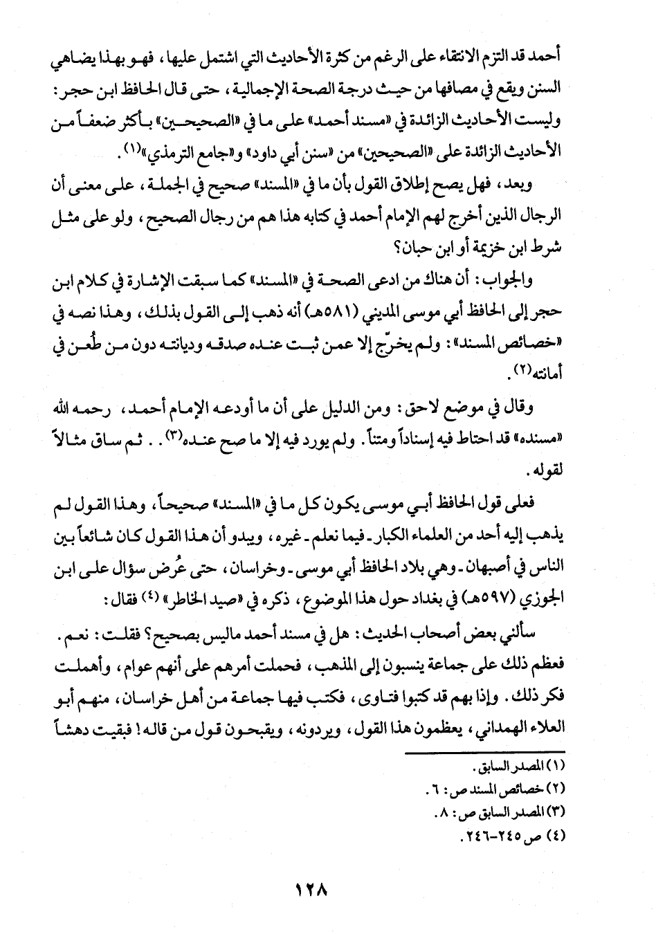 فعلى قول الحافظ أبي موسى يكون كل ما في "المسند" صحيحاً، وهذا القول لم يذهب إليه أحد مت العلماء الكبار -فيما نعلم- غيره، ويبدو أن هذا القول كان شائعاً بين الناس في أصبهان -وهي بلاد الحافظ أبي موسى- وخراسان، حتى عُرض سؤال على ابن الجوزي (597 هـ) في بغداد حول هذا الموضوع، ذكره في "صيد الخاطر" (¬4) فقال: