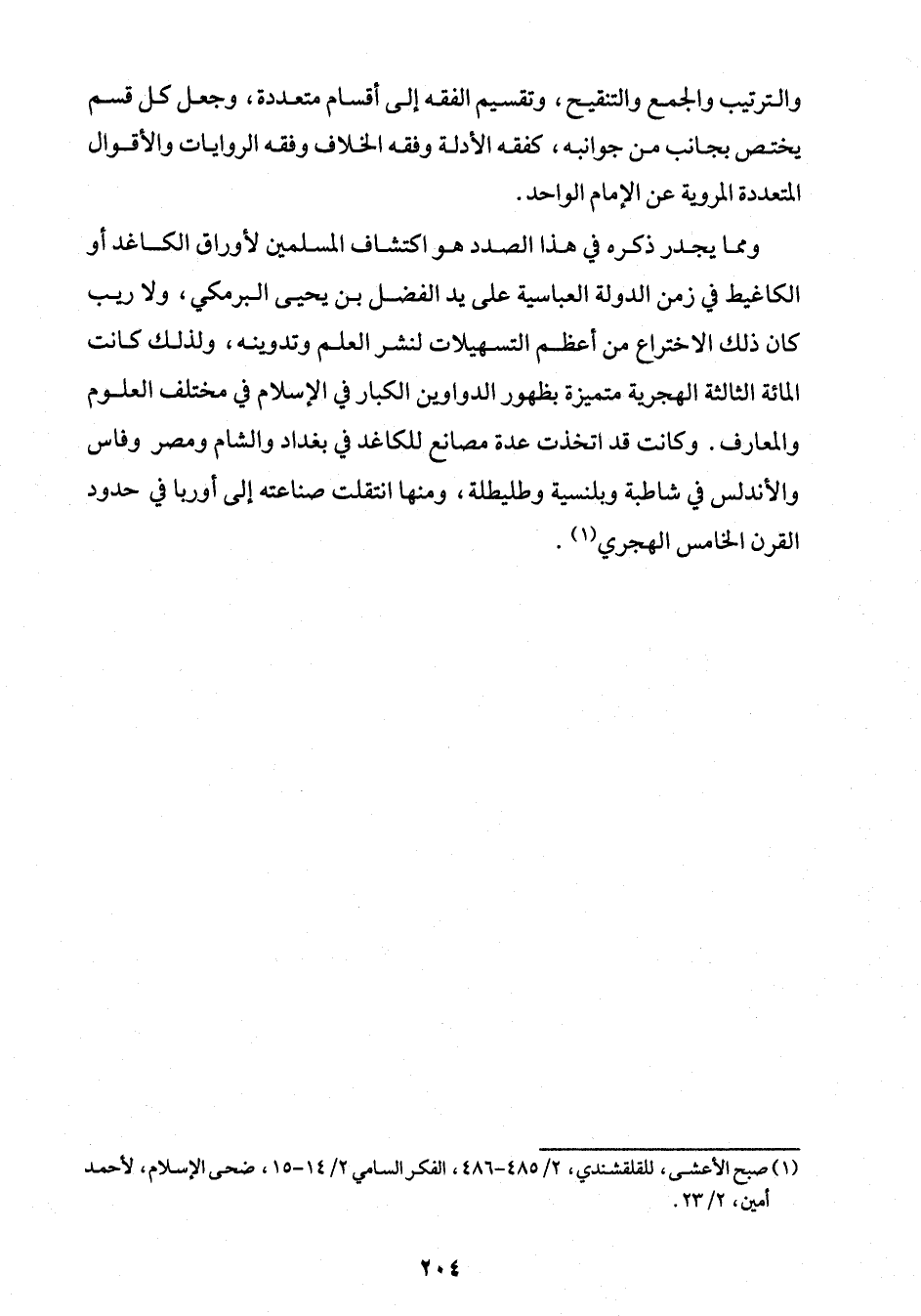 ومما يجدر ذكره في هذا الصدد هو اكتشاف المسلمين لأوراق الكاغد أو الكاغيط في زمن الدولة العباسية على يد الفضل بن يحيى البرمكي، ولا ريب كان ذلك الاختراع من أعظم التسهيلات لنشر العلم وتدوينه، ولذلك كانت المائة الثالثة الهجرية متميزة بظهور الدواوين الكبار في الإسلام في مختلف العلوم والمعارف. وكانت قد اتخذت عدة مصانع للكاغد في بغداد والشام ومصر وفاس والأندلس في شاطبة وبلنسية وطليطلة، ومنها انتقلت صناعته إلى أوربا في حدود القرن الخامس الهجري (¬1).