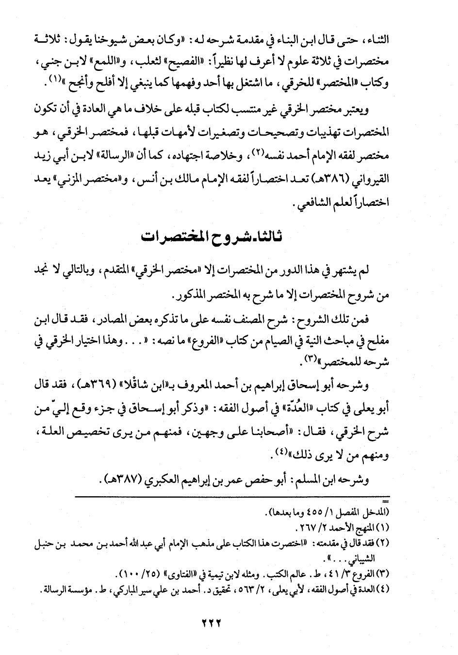 الثناء، حتى قال ابن البناء في مقدمة شرحه له: "وكان بعض شيوخنا يقول: ثلاثة مختصرات في ثلاثة علوم لا أعرف لها نظيرًا: "الفصيح"لثعلب، و"اللمع" لإبن جني، وكتاب "المختصر" للخرقي، ما اشتغل بها أحد وفهمها كما ينبغي إلا أفلح وأنجح" (¬1).