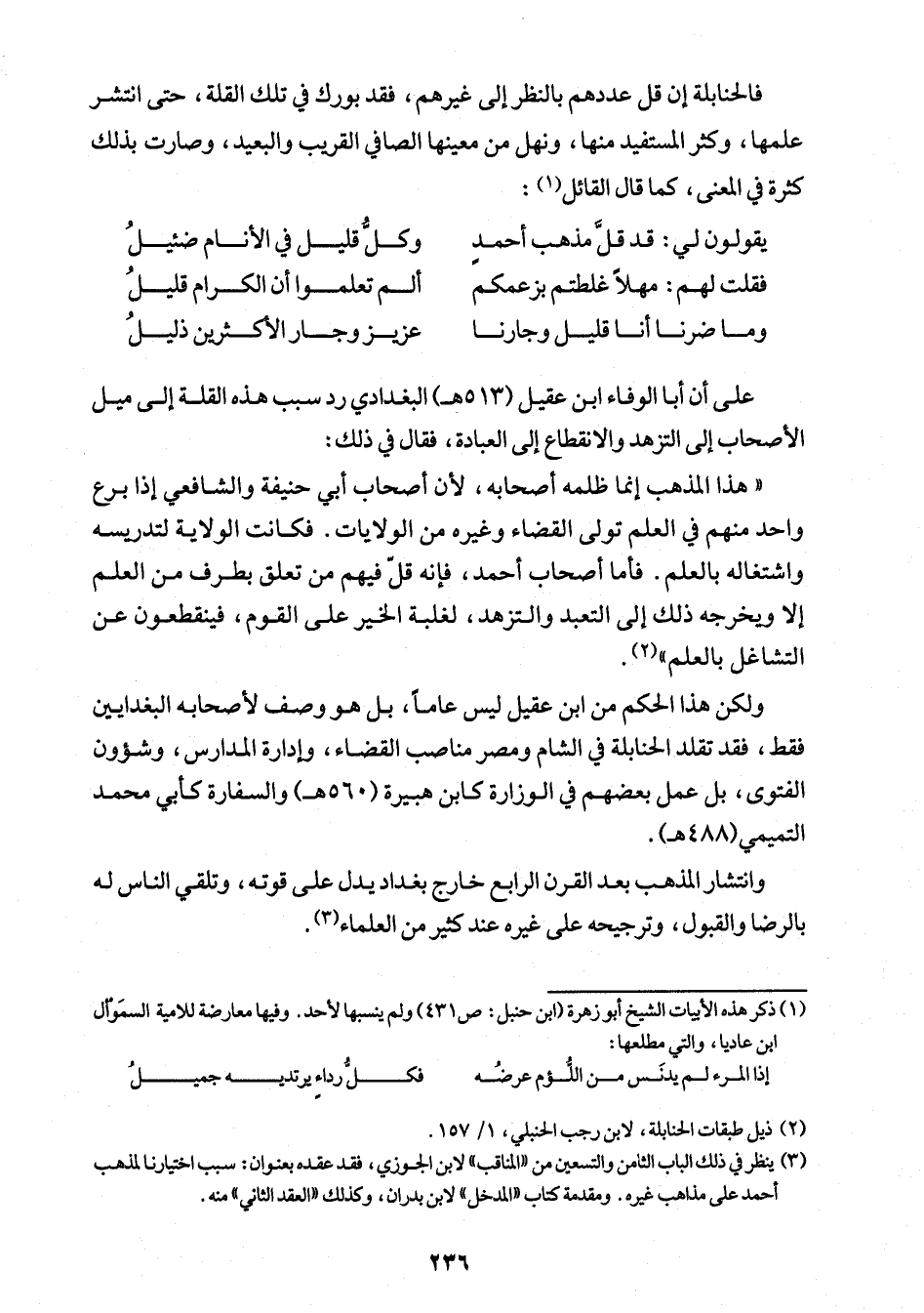 فالحنابلة إن قل عددهم بالنظر إلى غيرهم، فقد بورك في تلك القلة، حتى انتشر علمها، وكثر المستفيد منها، ونهل من معينها الصافي القريب والبعيد، وصارت بذلك كثرة في المعنى، كما قال القائل (¬1):