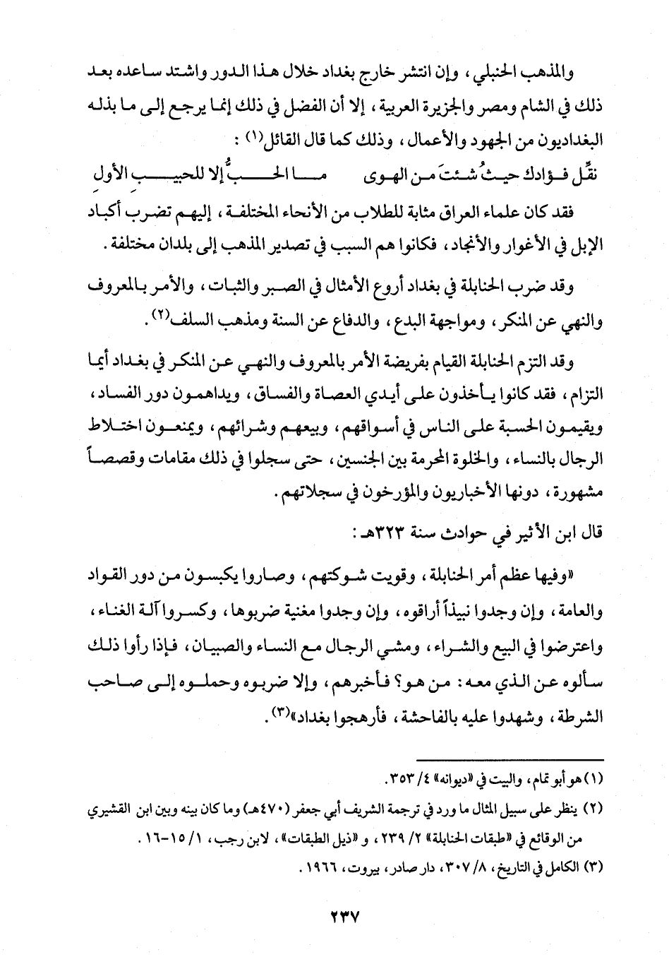 والمذهب الحنبلي، وإن انتشر خارج بغداد خلال هذا الدور واشتد ساعده بعد ذلك في الشام ومصر والجزيرة العربية، إلا أن الفضل في ذلك إنما يرجع إلى ما بذله البغداديون من الجهود والأعمال، وذلك كما قال القائل (¬1):