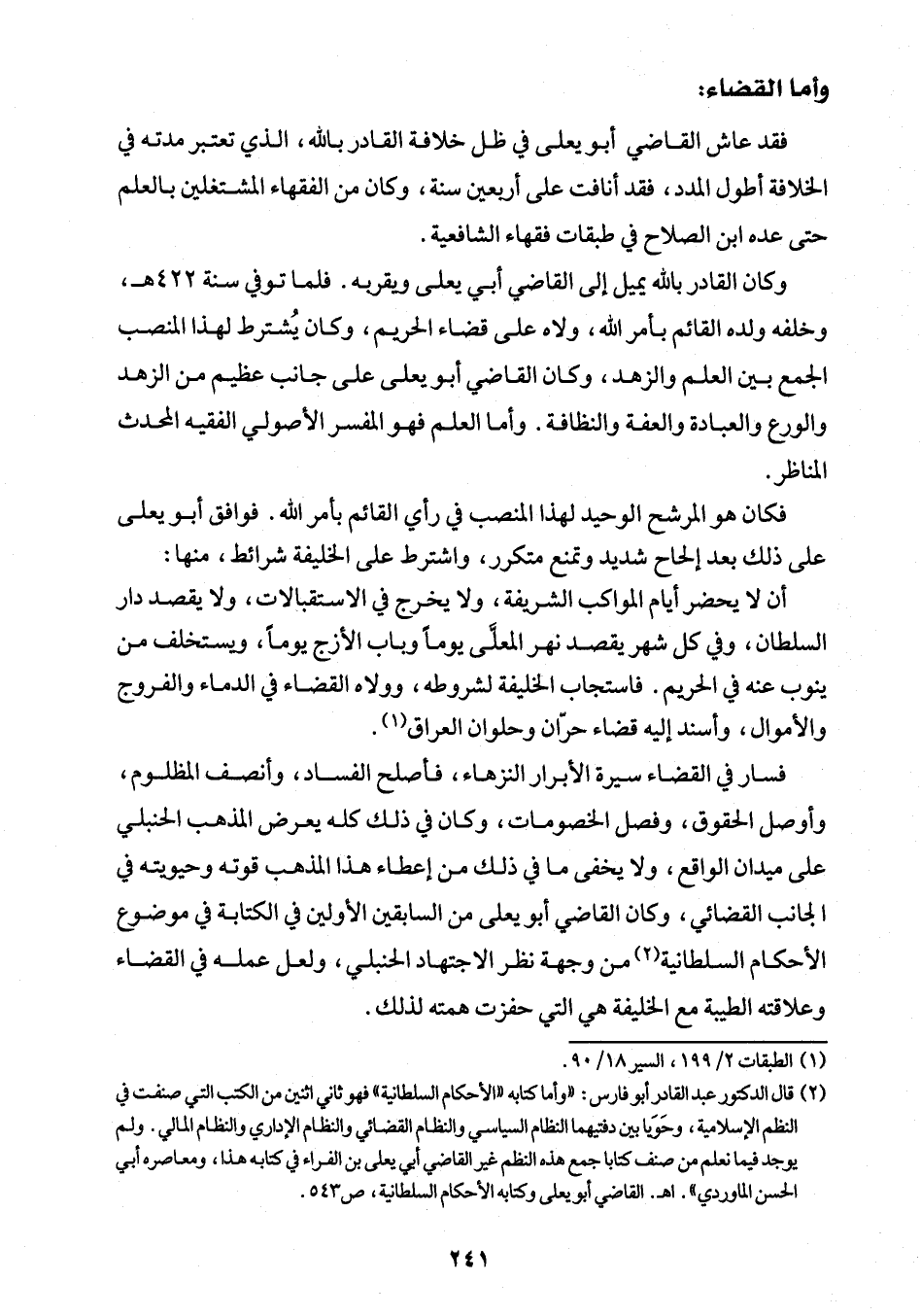 (¬2) قال الدكتور عبد القادر أبو فارس:"وأما كتابه"الأحكام السلطانية" فهو ثاني اثنين من الكتب التي صنفت في النظم الإسلامية، وحَوَيا بين دفتيهما النظام السياسي والنظام القضائي والنظام الإداري والنظام المالي. ولم يوجد فيما نعلم من صنف كتابا جمع هذه النظم غير القاضي أبي يعلى بن الفراء في كتابه هنا، ومعاصره أبي الحسن الماوردي". اهـ. القاض أبو يعلى وكتابه الأحكام السلطانية، ص 543.