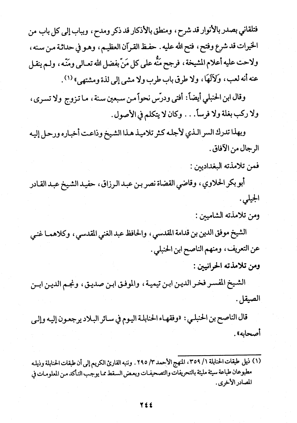 (¬1) ذيل طبقات الحنابلة 1/ 359، المنهج الأحمد 3/ 295. وننبه القارئ الكريم إلى أن طبقات الحنابلة وذيله مطبوعان طباعة سيئة مليئة بالتحريفات والتصحيفات وبعض السقط مما يوجب التأكد من المعلومات في المصادر الأخرى.