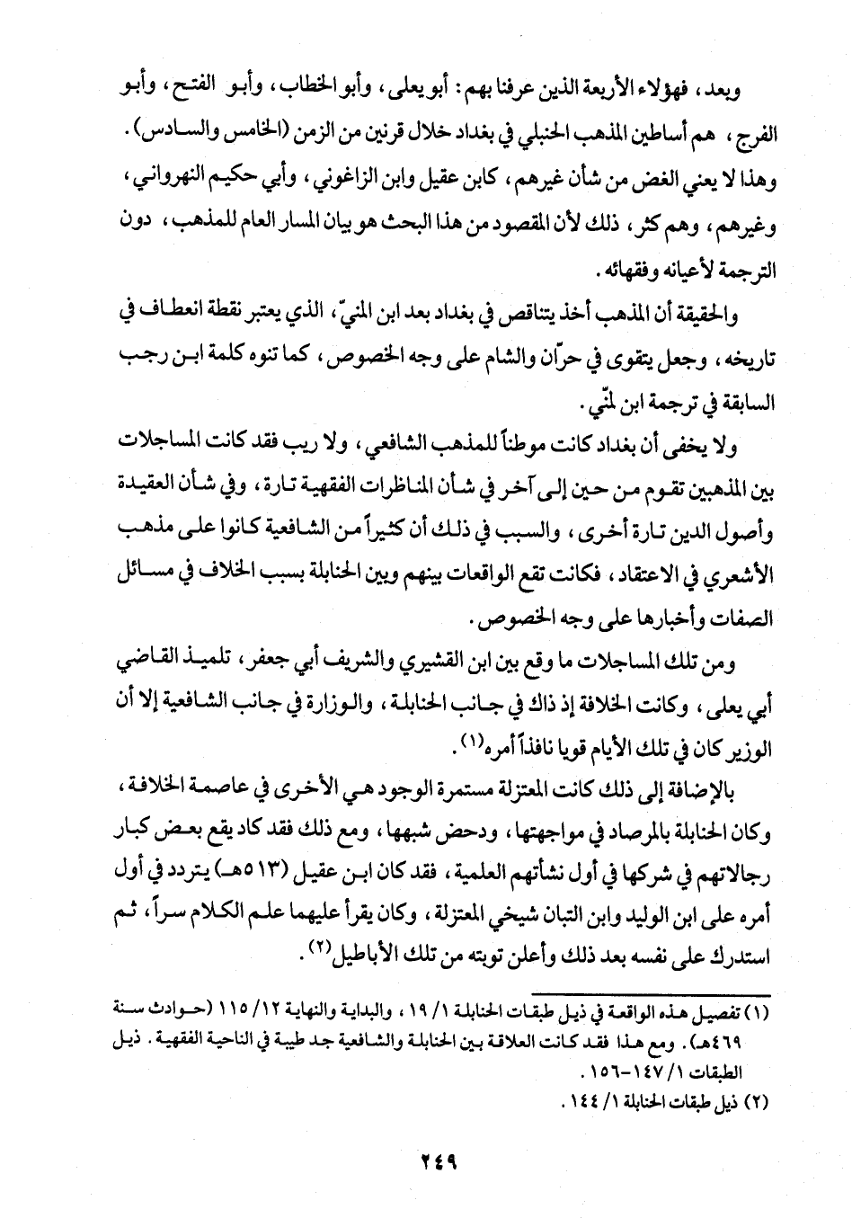 (¬1) تفصيل هذه الواقعة في ذيل طبقات الحنابلة 1/ 19، والبداية والنهاية 12/ 115 (حوادث سنة 469 هـ). ومع هذا نقد كانت العلاقة بين الحنابلة والشافعية جد طيبة في الناحية الفقهية. ذيل الطبقات 1/ 147 - 156.