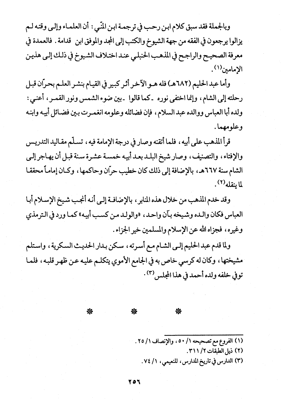 وأما عبد الحليم (682 هـ) فله هو الآخر أثر كبير في القيام بنشر العلم بحرّان قبل رحلته إلى الشام، وإنما اختفى نوره -كما قالوا- بين ضوء الشمس ونور القمر، أعني: ولده أبا العباس ووالده عبد السلام، فإن فضائله وعلومه انغمرت بين فضائل أبيه وابنه وعلومهما.