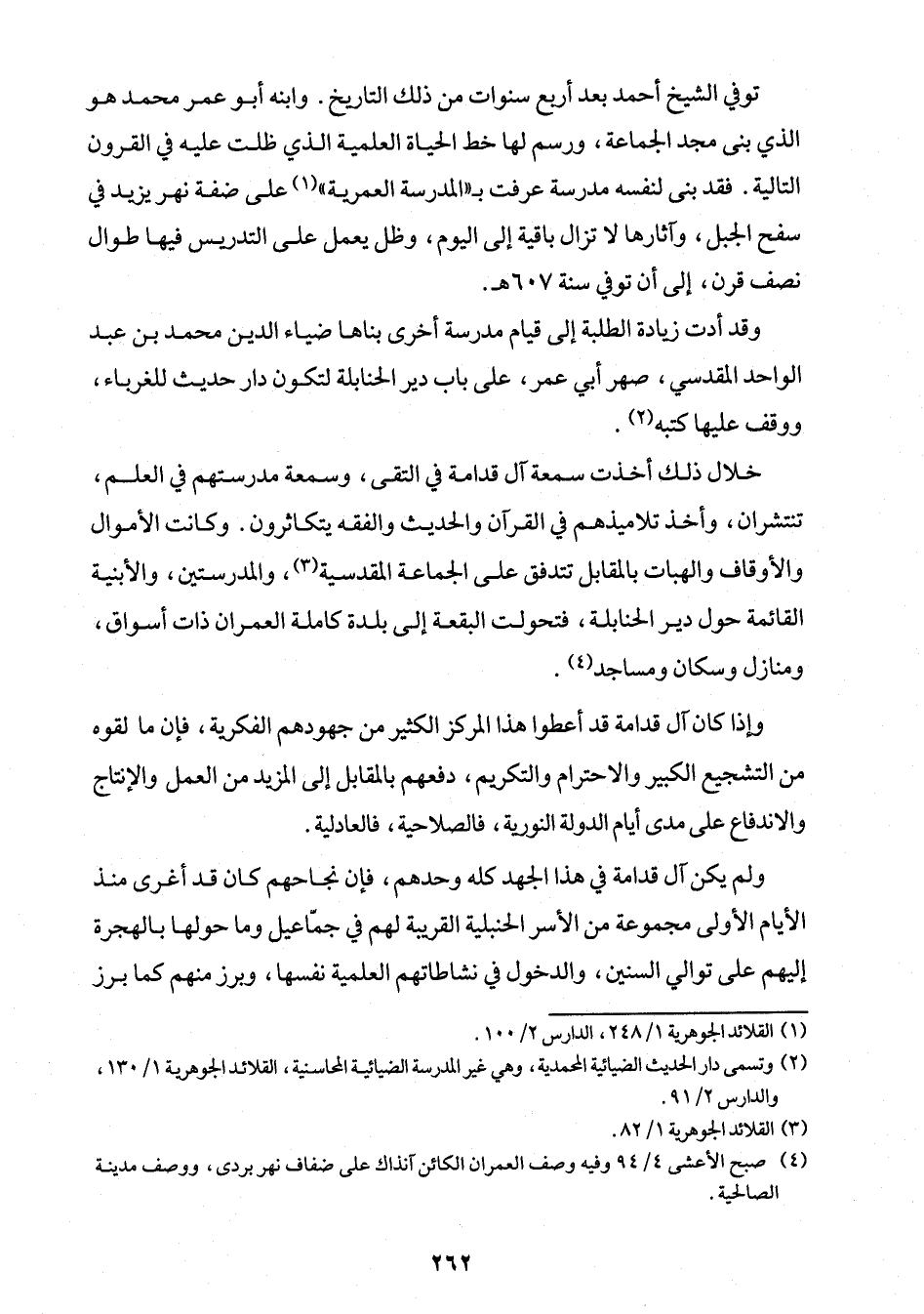 خلال ذلك أخذت سمعة آل قدامة في التقى، وسمعة مدرستهم في العلم، تنتشران، وأخذ تلاميذهم في القرآن والحديث والفقه يتكاثرون. وكانت الأموال والأوقاف والهبات بالمقابل تتدفق على الجماعة المقدسية (¬3)، والمدرستين، والأبنية القائمة حول دير الحنابلة، فتحولت البقعة إلى بلدة كاملة العمران ذات أسواق، ومنازل وسكان ومساجد (¬4).
