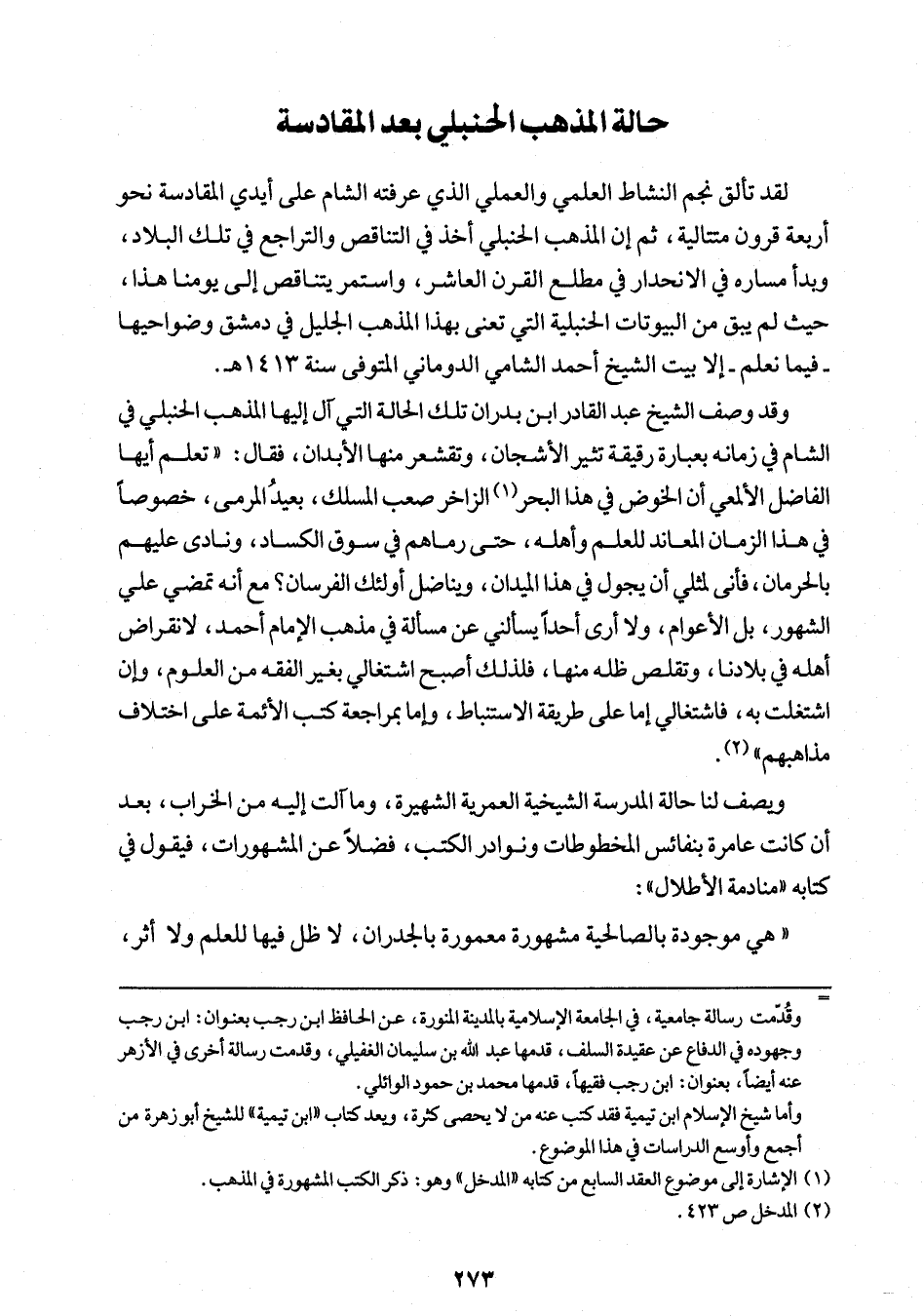 وقد وصف الشيخ عبد القادر ابن بدران تلك الحالة التي آل إليها المذهب الحنبلي في الشام في زمانه بعبارة رقيقة تثير الأشجان، وتقشعر منها الأبدان، فقال: "تعلم أيها الفاضل الألمعي أن الخوض في هذا البحر (¬1) الزاخر صعب المسلك، بعيدُ المرمى، خصوصًا في هذا الزمان المعاند للعلم وأهله، حتى رماهم في سوق الكساد، ونادى عليهم بالحرمان، فأنى لمثلي أن يجول في هذا الميدان، ويناضل أولئك الفرسان؟ مع أنه تمضي علي الشهور، بل الأعوام، ولا أرى أحدًا يسألني عن مسألة في مذهب الإمام أحمد، لإنقراض أهله في بلادنا، وتقلص ظله منها، فلذلك أصبح اشتغالي بغير الفقه من العلوم، وإن اشتغلت به، فاشتغالي إما على طريقة الإستنباط، وإما بمراجعة كتب الأئمة على اختلاف مذاهبهم" (¬2).