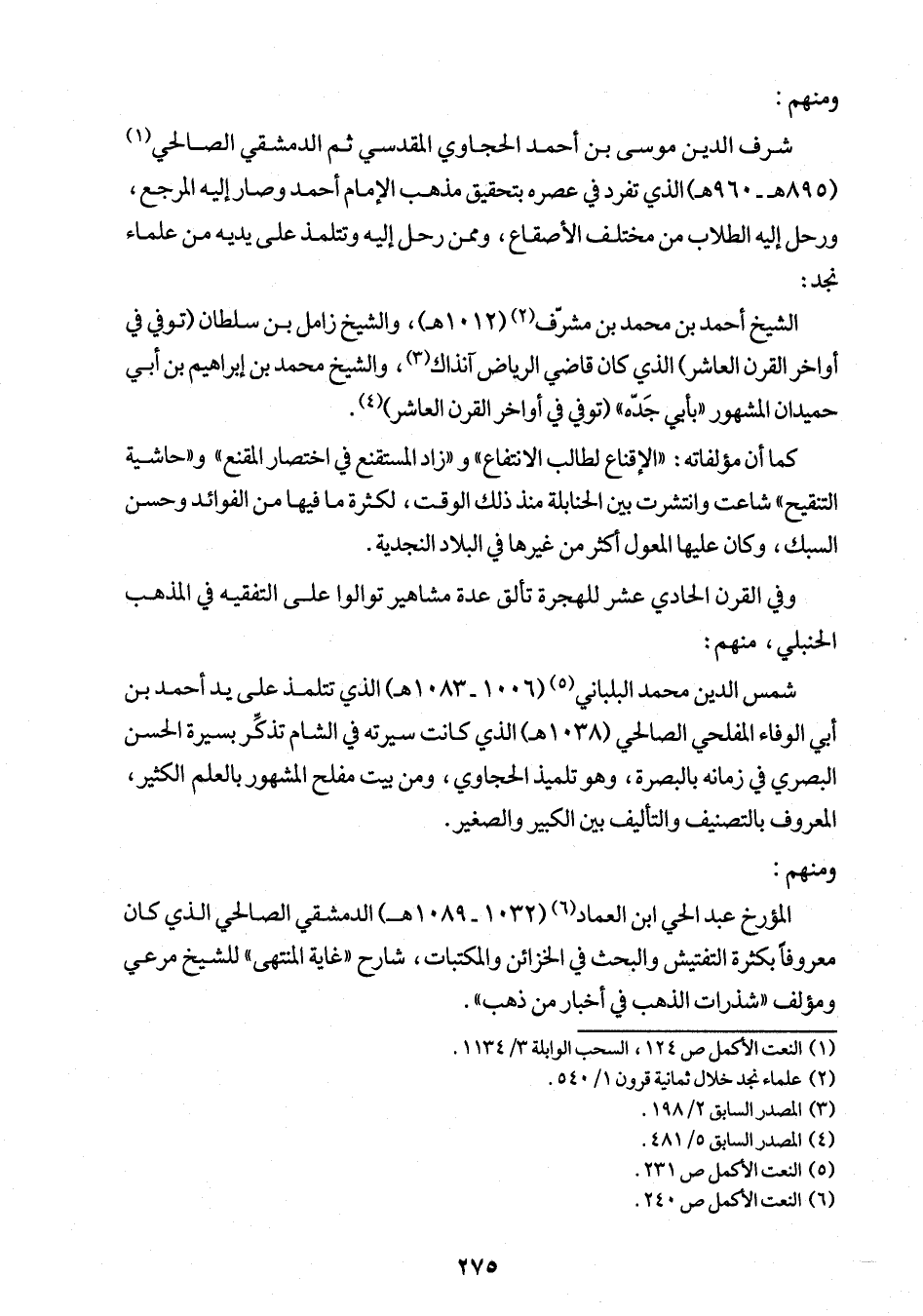 شمس الدين محمد البلباني (¬5) (1006 - 1083 هـ) الذي تتلمذ على يد أحمد بن أبي الوفاء المفلحي الصالحي (1038 هـ) الذي كانت سيرته في الشام تذكِّر بسيرة الحسن البصري في زمانه بالبصرة، وهو تلميذ الحجاوي، ومن بيت مفلح المشهور بالعلم الكثير، المعروف بالتصنيف والتأليف بين الكبير والصغير.