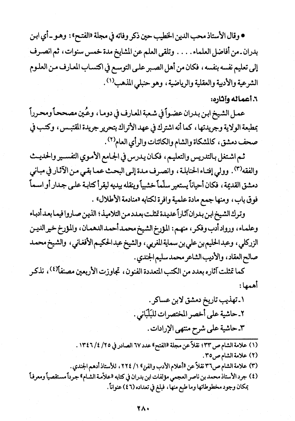 (¬4) جرد الأستاذ محمد بن ناصر العجمي مؤلفات ابن بدران في كتابه "علّامة الشام" جردًا مستقصيًا ومعرفًا بمكان وجود مخطوطاتها وما طبع منها، فبلغ في تعداده (46) عوانًا.