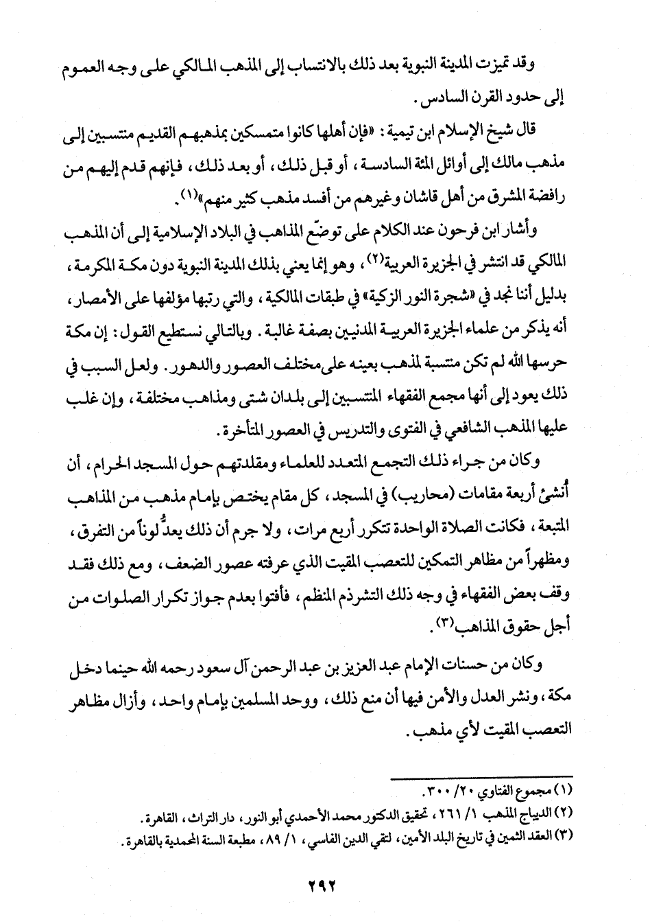 وأشار ابن فرحون عند الكلام على توضّع المذاهب في البلاد الإسلامية إلى أن المذهب المالكي قد انتشر في الجزيرة العريية (¬2)، وهو إنما يعني بذلك المدينة النبوية دون مكة المكرمة، بدليل أننا نجد في "شجرة النور الزكية" في طبقات المالكية، والتي رتبها مؤلفها على الأمصار، أنه يذكر من علماء الجزيرة العربية المدنيين بصفة غالبة. وبالتالي نستطيع القول: إن مكة حرسها الله لم تكن منتسبة لمذهب بعينه على مختلف العصور والدهور. ولعل السبب في ذلك يعود إلى أنها مجمع الفقهاء المتتسبين إلى بلدان شتى ومذاهب مختلفة، وإن غلب عليها المذهب الشافعي في الفتوى والتدريس في العصور المتأخرة.
