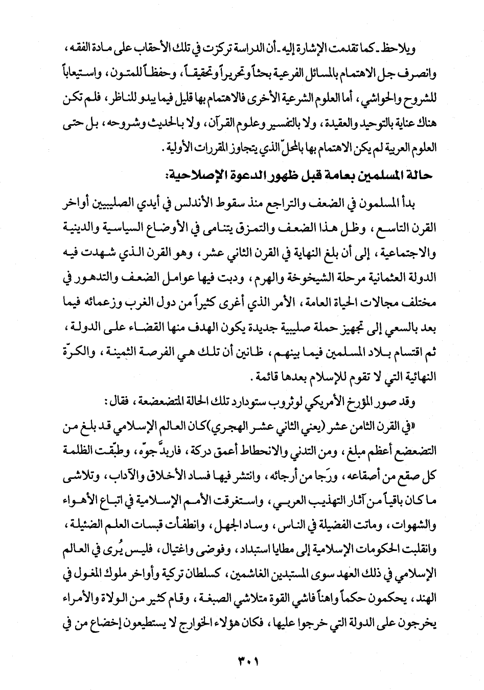 "في القرن الثامن عشر (يعني الثاني عشر الهجري) كان العالم الإسلامي قد بلغ من التضعضع أعظم مبلغ، ومن التدني والإنحطاط أعمق دركة، فاربدَّ جوّه، وطبّقت الظلمة كل صقع من أصقاعه، ورَجا من أرجائه، وانتشر فيها فساد الأخلاق والآداب، وتلاشى ما كان باقياً من آثار التهذيب العربي، واستغرقت الأمم الإسلامية فى اتباع الأهواء والشهوات، وماتت الفضيلة في الناس، وساد الجهل، وانطفأت قبسات العلم الضئيلة، وانقلبت الحكومات الإسلامية إلى مطايا استبداد، وفوض واغتيال، فليس يُرى في العالم الإسلامي في ذلك العهد سوى المستبدين الغاشمين، كسلطان تركية وأواخر ملوك المغول في الهند، يحكمون حكماً واهناً فاشي القوة متلاشي الصبغة، وقام كثير من الولاة والأمراء يخرجون على الدولة التي خرجوا عليها، فكان هؤلاء الخوارج لا يستطيعون إخضاع من في