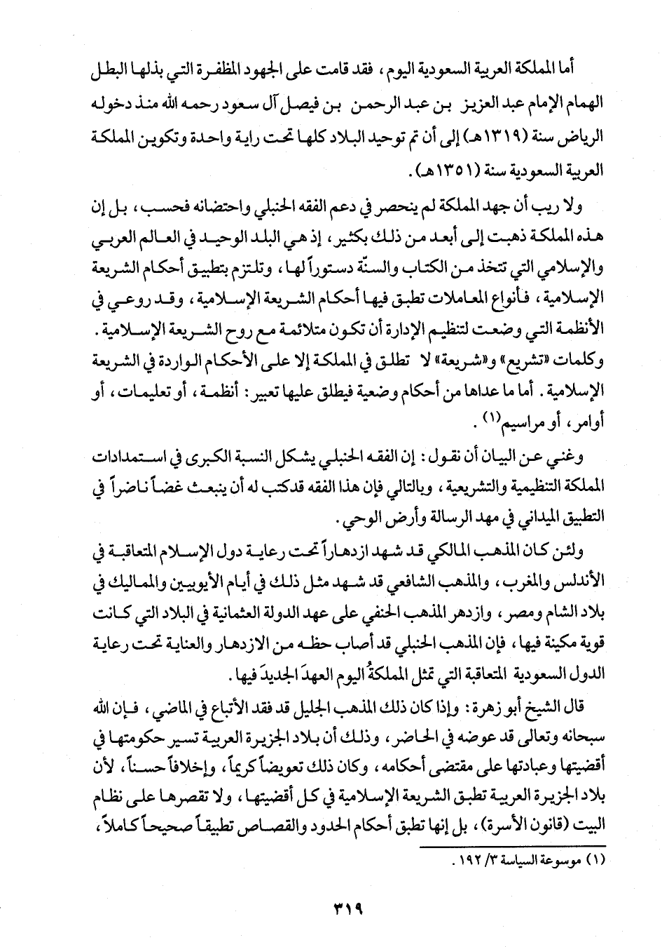 ولا ريب أن جهد المملكة لم ينحصر في دعم الفقه الحنبلى واحتضانه فحسب، بل إن هذه المملكة ذهبت إلى أبعد من ذلك بكثير، إذ هي البلد الوحيد في العالم العربي والإسلامي التي تتخذ من الكتاب والسنّة دستوراً لها، وتلتزم بتطبيق أحكام الشريعة الإسلامية، فأنواع المعاملات تطبق فيها أحكام الشريعة الإسلامية، وقد روعي في الأنظمة التي وضعت لتنظيم الإدارة أن تكون متلائمة مع روح الشريعة الإسلامية. وكلمات "تشريع" و"شريعة" لا تطلق في الملكة إلا على الأحكام الواردة في الشريعة الإسلامية. أما ما عداها من أحكام وضعية فيطلق عليها تعبير: أنظمة، أو تعليمات، أو أوامر، أو مراسيم (¬1).