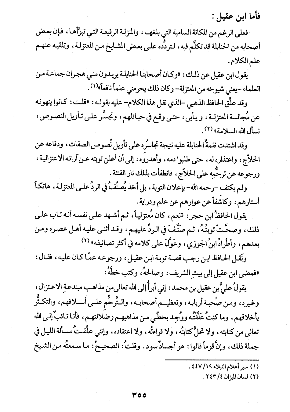 ونَقل الحافظ ابن رجب قصة توبة ابن عقيل، ورجوعه عمّا كان عليه، فقال: "فمضى ابن عقيل إلى بيتِ الشريف، وصالحهُ، وكتب خطَّهُ: