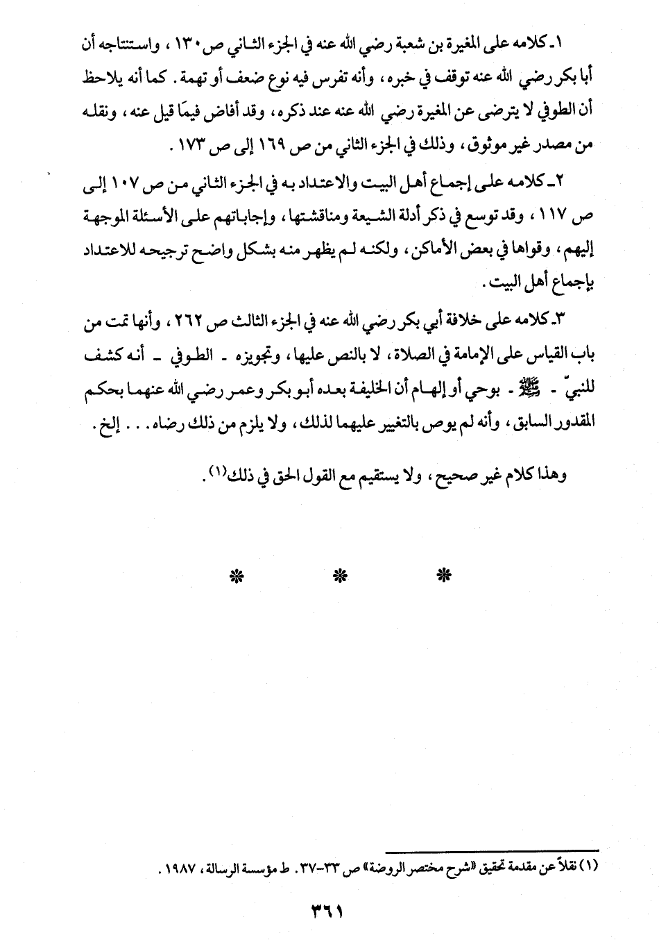1 - كلامه على المغيرة بن شعبة - رضي الله عنه - في الجزء الثاني ص 130، واستنتاجه أن أبا بكر - رضي الله عنه - توقف في خبره، وأنه تفرس فيه نوع ضعف أو تهمة. كما أنه يلاحظ أن الطوفي لا يترضى عن المغيرة - رضي الله عنه - عند ذكره، وقد أفاض فيمَا قيل عنه، ونقله من مصدر غير موثوق، وذلك في الجزء الثاني من ص 169 إلى ص 173.