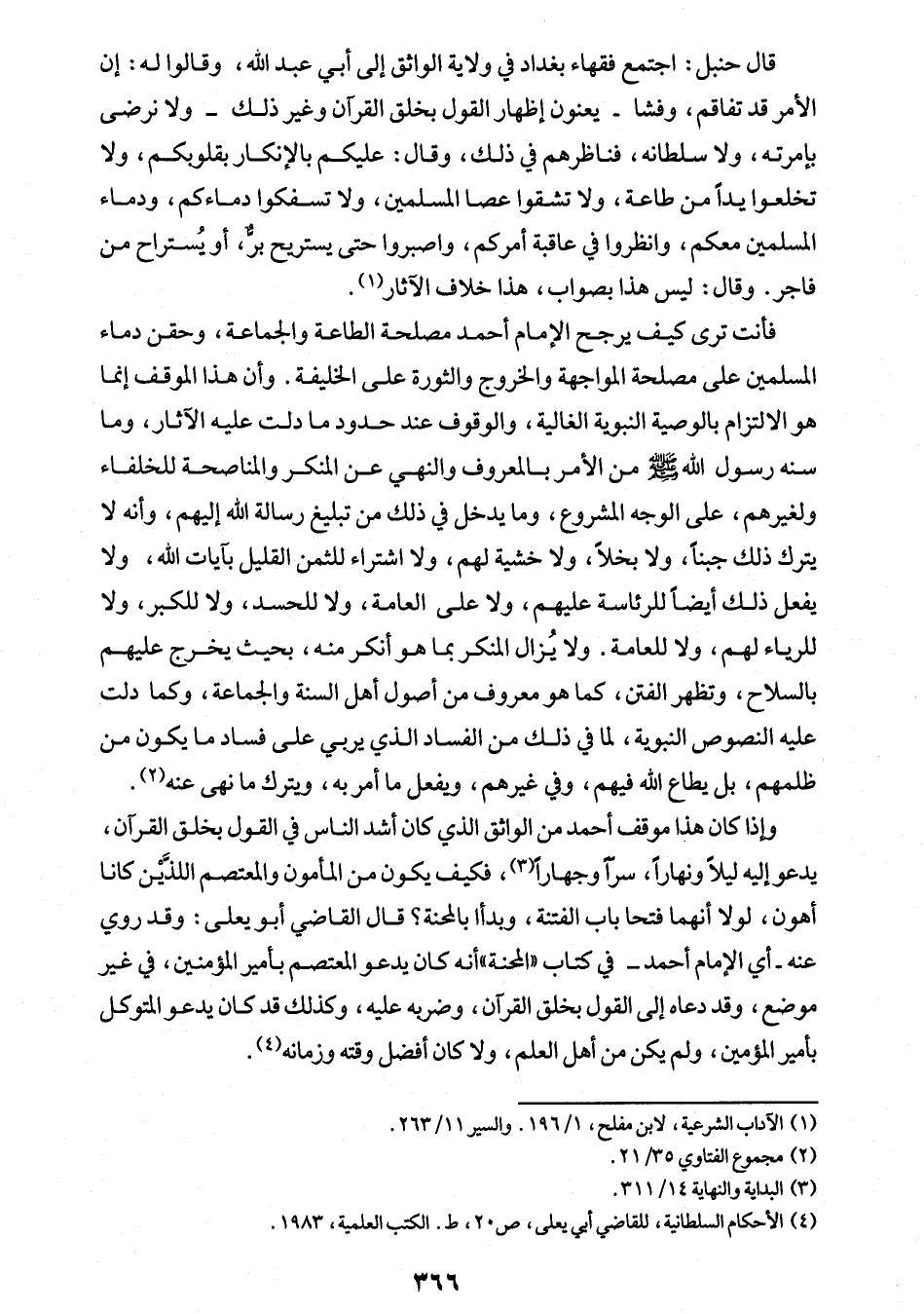فأنت ترى كيف يرجح الإمام أحمد مصلحة الطاعة والجماعة، وحقن دماء المسلمين على مصلحة المواجهة والخروج والثورة على الخليفة. وأن هذا الموقف إنما هو الإلتزام بالوصية النبوية الغالية، والوقوف عند حدود ما دلت عليه الآثار، وما سنه رسول الله - صلى الله عليه وسلم - من الأمر بالمعروف والنهي عن المنكر والمناصحة للخلفاء ولغيرهم، على الوجه المشروع، وما يدخل في ذلك من تبليغ رسالة الله إليهم، وأنه لا يترك ذلك جبناً، ولا بخلاً، ولا خشية لهم، ولا اشتراء للثمن القليل بآيات الله، ولا يفعل ذلك أيضاً للرئاسة عليهم، ولا على العامة، ولا للحسد، ولا للكبر، ولا للرياء لهم، ولا للعامة. ولا يُزال المنكر بما هو أنكر منه، بحيث يخرج عليهم بالسلاح، وتظهر الفتن، كما هو معروف من أصول أهل السنة والجماعة، وكما دلت عليه النصوص النبوية، لما في ذلك من الفساد الذي يربي على فساد ما يكون من ظلمهم، بل يطاع الله فيهم، وفي غيرهم، ويفعل ما أمر به، ويترك ما نهى عنه (¬2).
